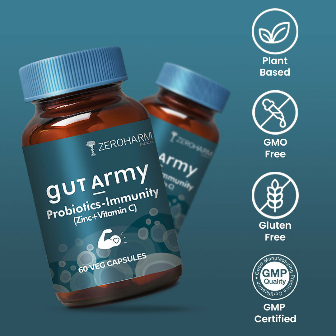 Zeroharm Sciences Gut Army Probiotics-Immunity Vegetable Capsule is rich with zinc and vitamin C, helps to boost immunity, and replenishes the deficiency of vitamins and minerals in the body. It improves gut health and the well-being of the body.