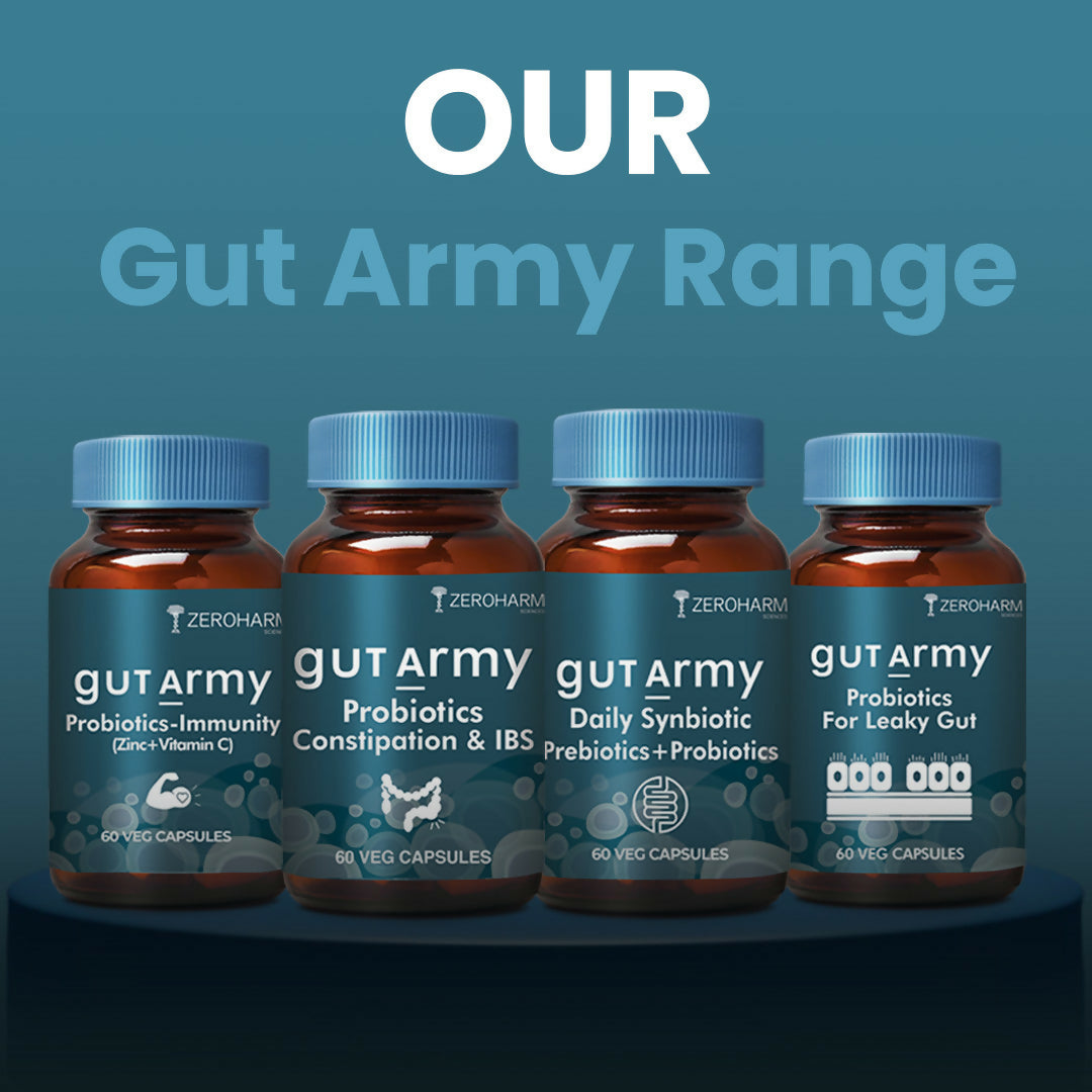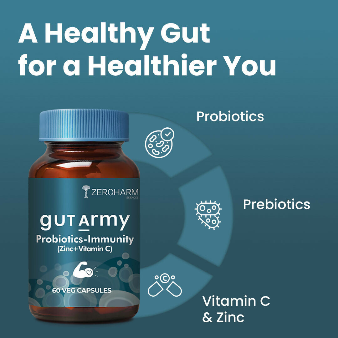 ZEROHARM Gut Army Probiotics & Prebiotics with Vitamin C & Zinc - Advanced Digestive Health & Immunity Support Supplement for Men & Women - 60 Capsules