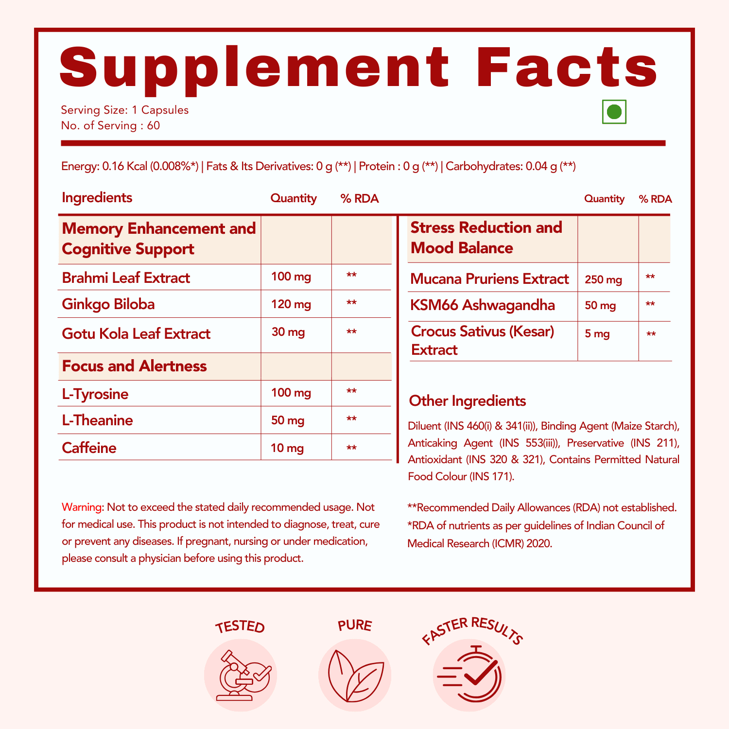 - L-Tyrosine: 100 mg, Brahmi Leaf Extract (10% Saponins): 100 mg,