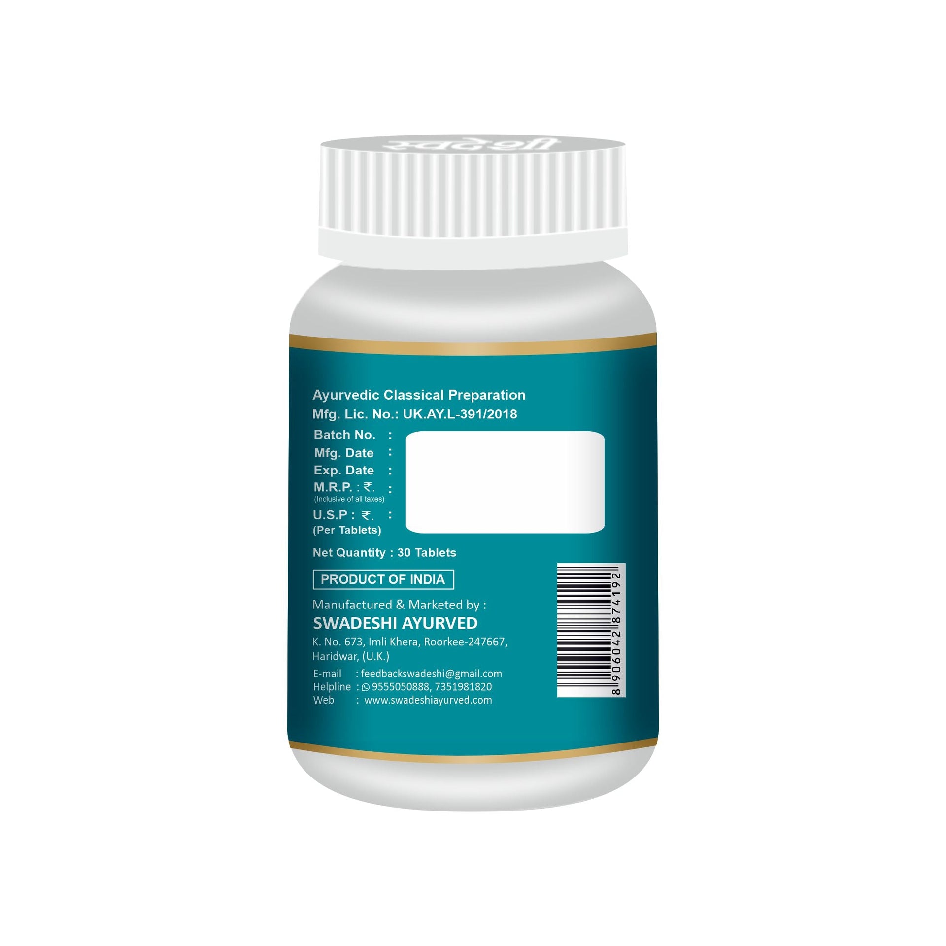 Swadeshi Prabhakar Vati is an Ayurvedic formulation that may help to support heart health and overall well-being. It contains a unique blend of potent herbs and minerals, including Swarnmakshik Bhasma, Lauh Bhasma, Abhrak Bhasma, Vanshlochan Churna, and Shudh Shilajit, traditionally used in Ayurveda for their rejuvenating properties. This supplement may help in maintaining cardiovascular function, supporting cholesterol balance, and promoting healthy iron levels. With a carefully curated composition, it may assist in supporting healthy blood pressure, provide essential nourishment to the body, and promote relaxation.