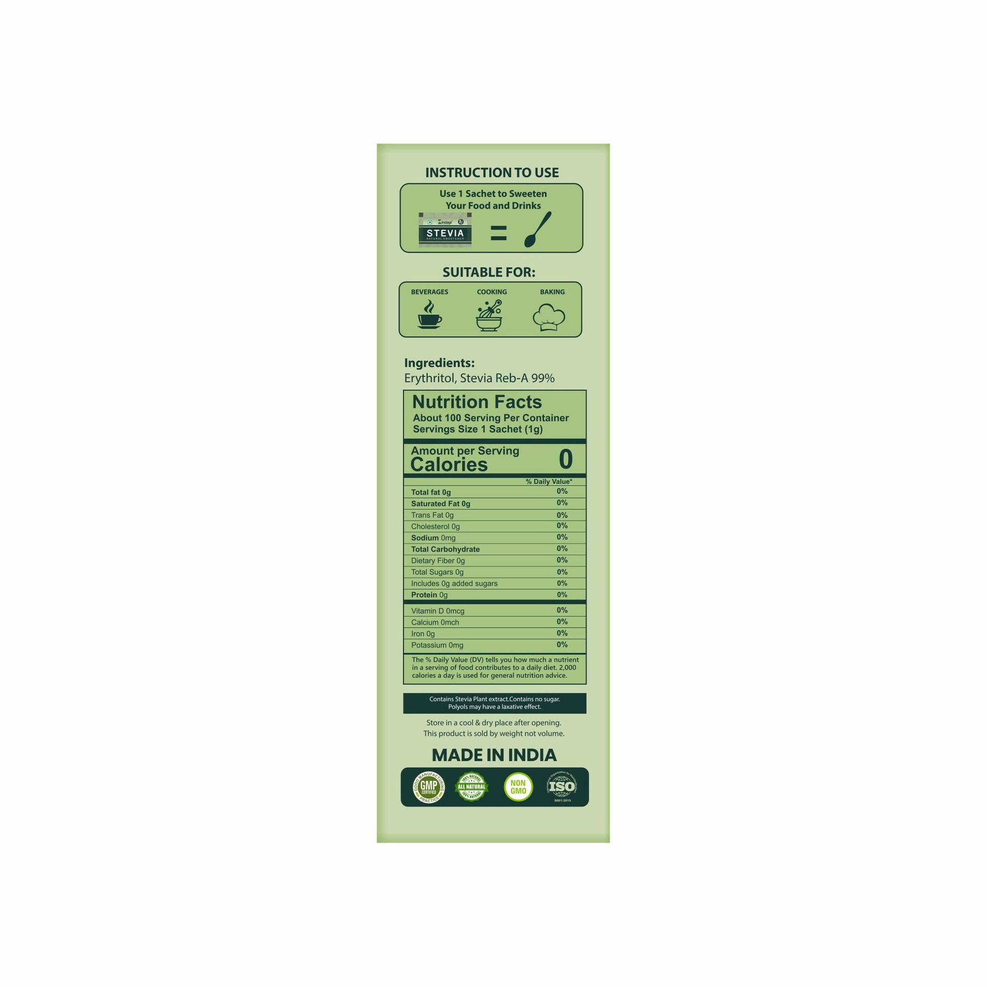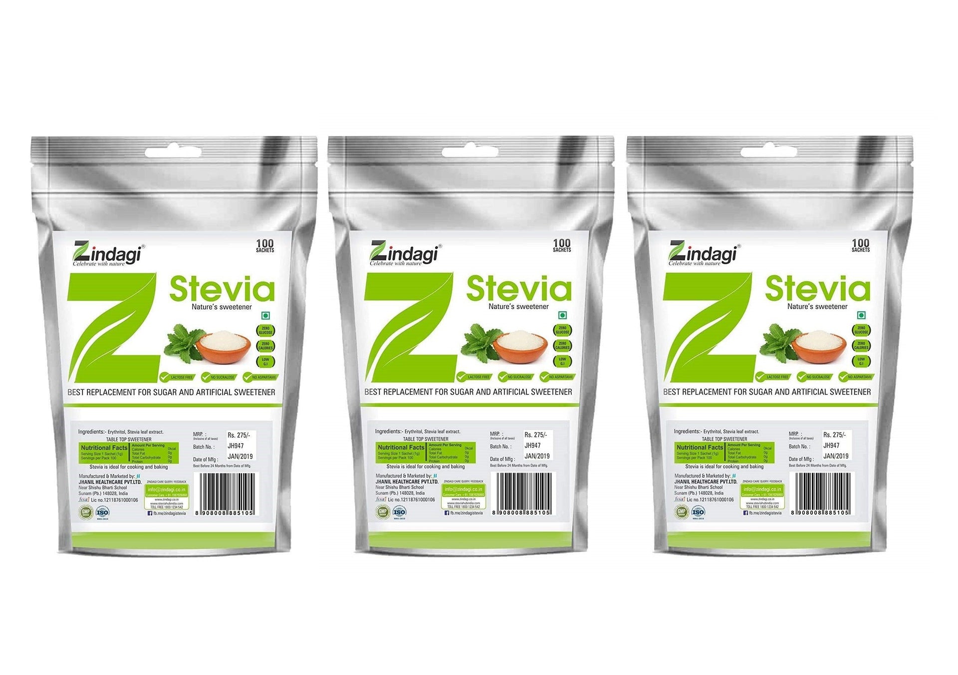 Zindagi Stevia Sachet (1gm Each) is a natural, healthful new-generation substitute of refined sugar (incredibly harmful to human health) loaded with the goodness of Stevia leaf Extract and erythritol. Stevia is a small sweet shrub native to Brazil and Paraguay. The stevia leaf contains several very similar compounds or steviol glycosides that are naturally sweet. In its highly purified form, it has sweetness between 250 to 300 times more than cane sugar but without any calories or any effect on blood sugar levels.