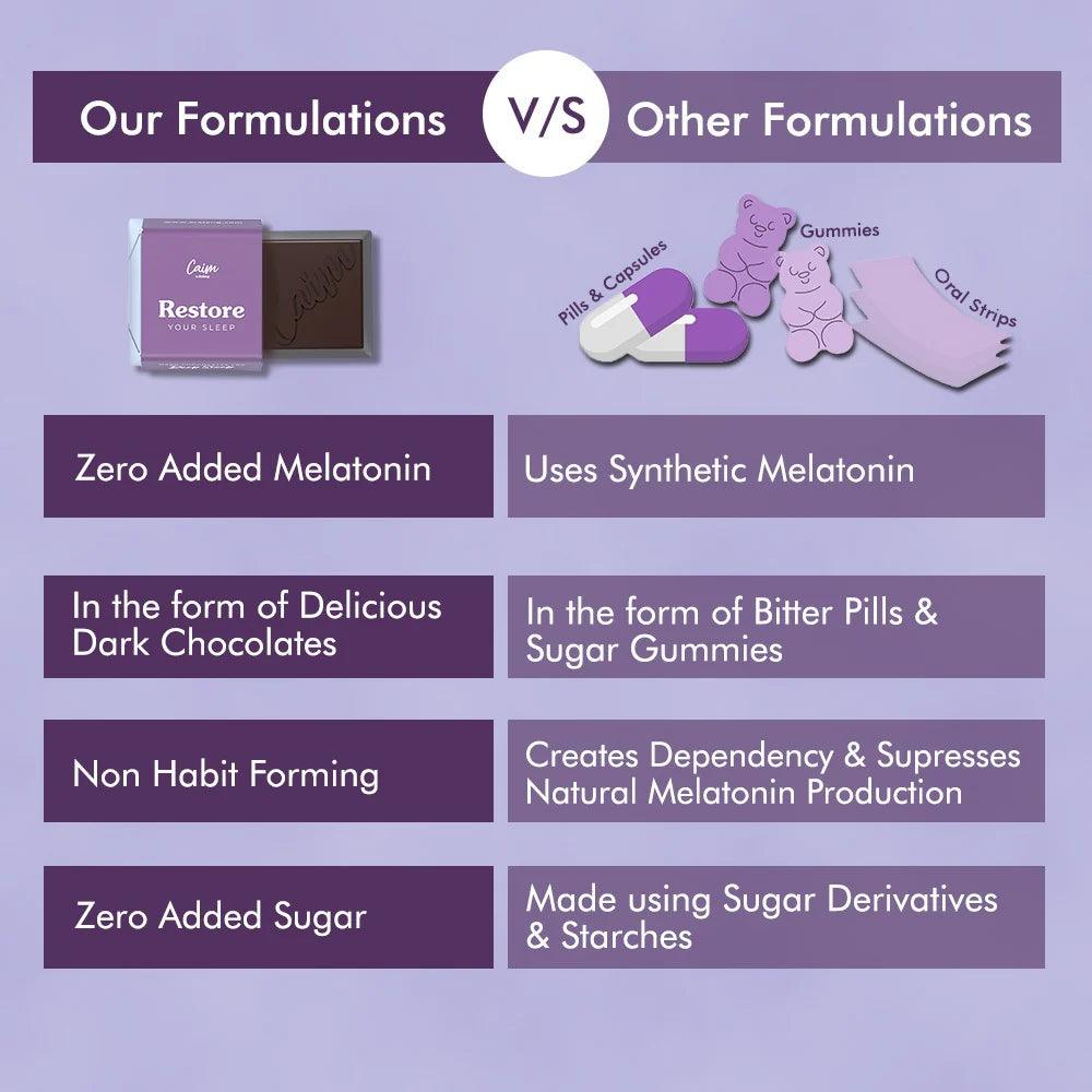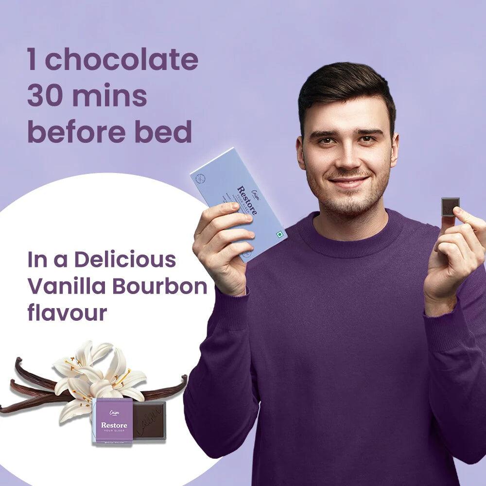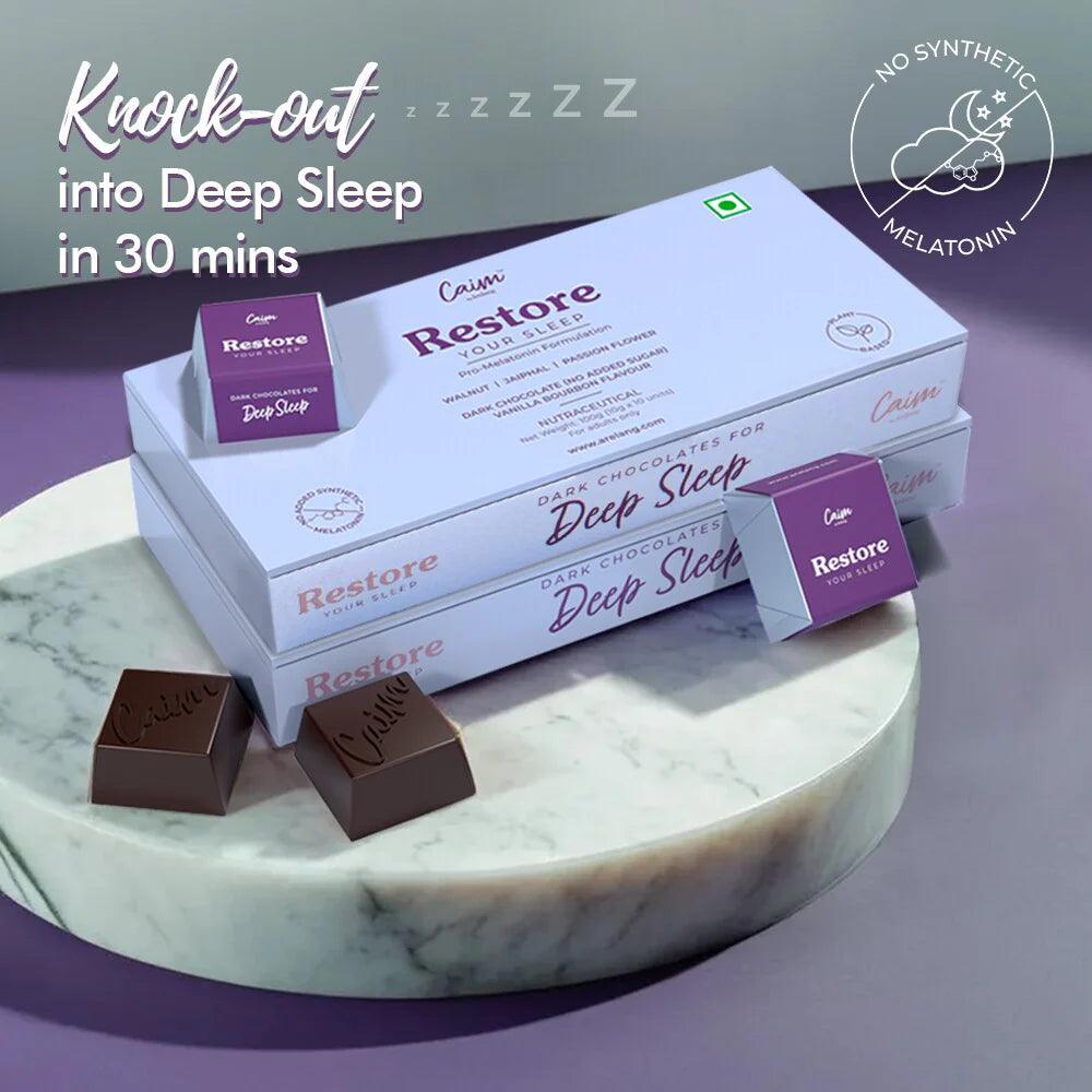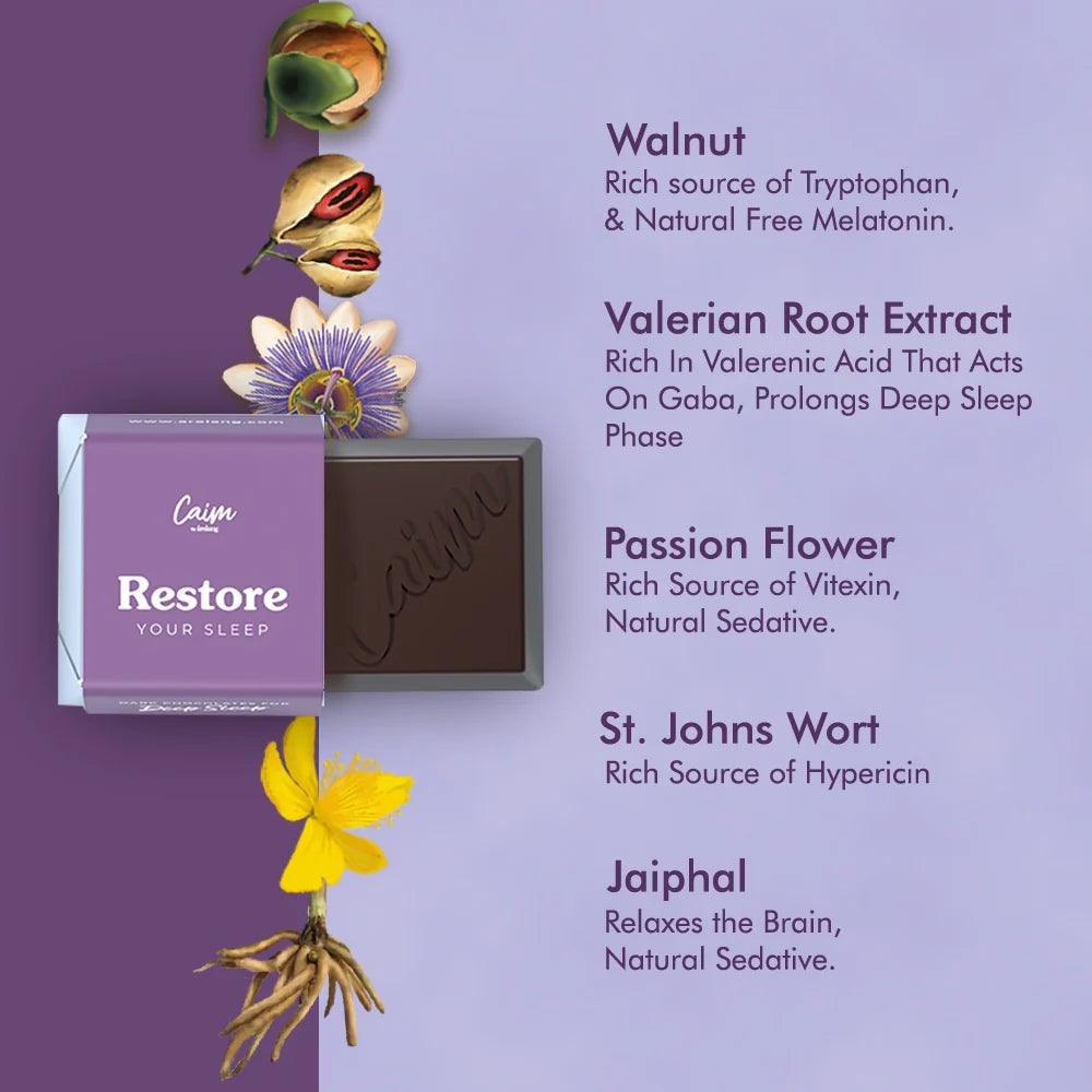 Caim by arelang Restore your Sleep THINS Sugar Free Dark Chocolates: Is a proprietary blend of 5 potent plant-based extracts to help your body knock out into the most restful sleep ever, without using any synthetic form of melatonin. Our formulation not only reduces the time taken to fall asleep thereby inducing sleep faster (30 mins to knock out!), but also helps you relax before bed and finally prolongs the time you spend in your NREM sleep.