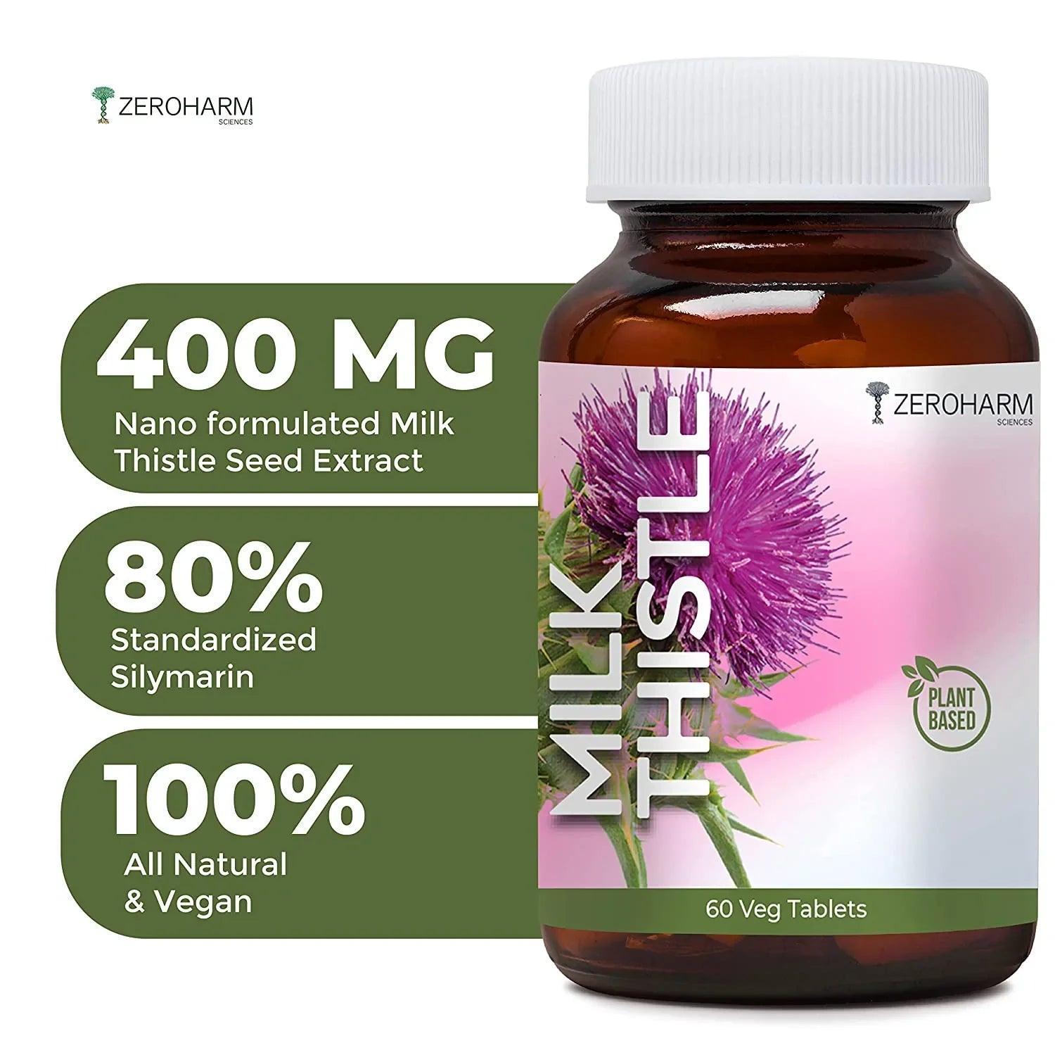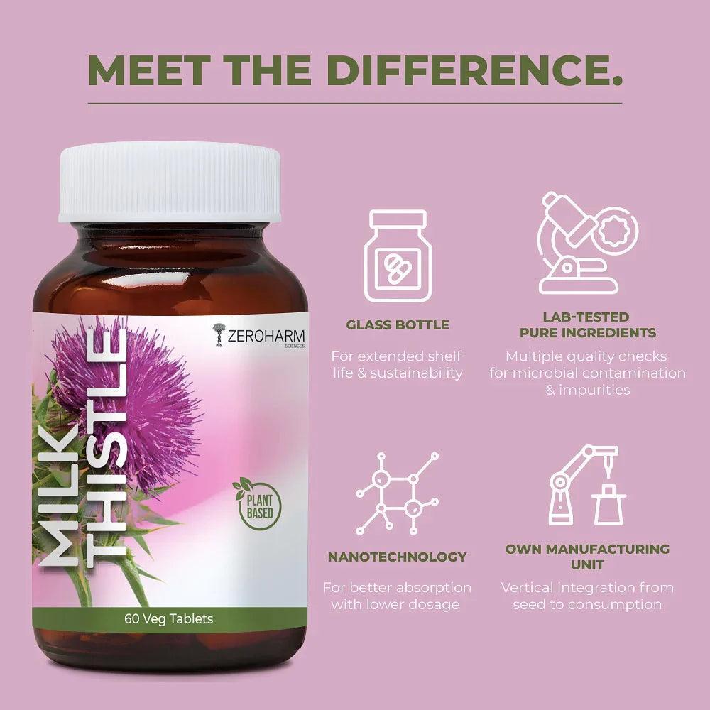 Zeroharm Sciences Plant Based Milk Thistle Veg Tablet contains anti-inflammation and antioxidant properties. It helps maintain healthy liver function and relieves fatty liver and poor gallbladder health. It improves overall gut health and the well-being of the body.