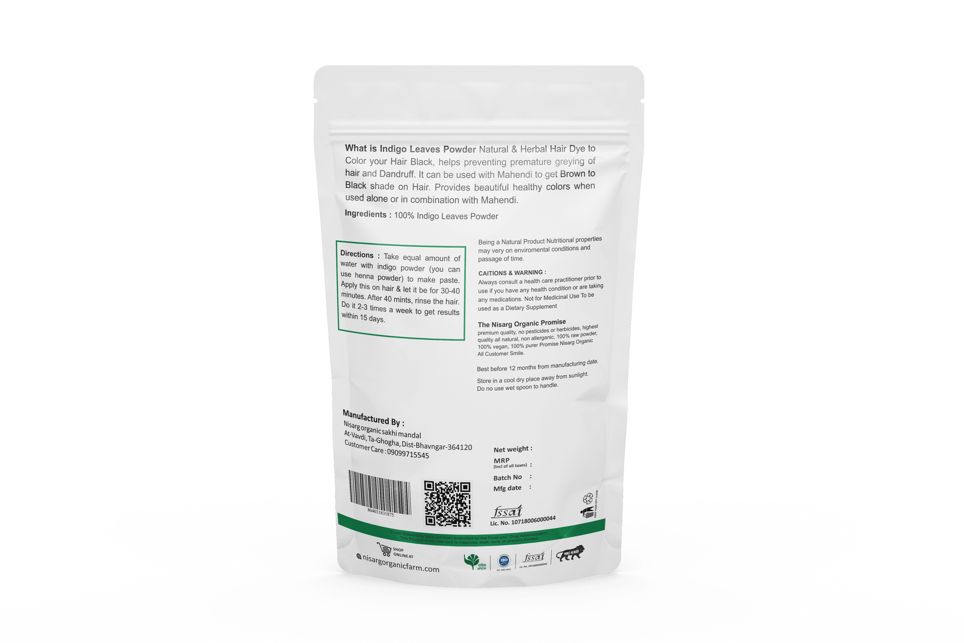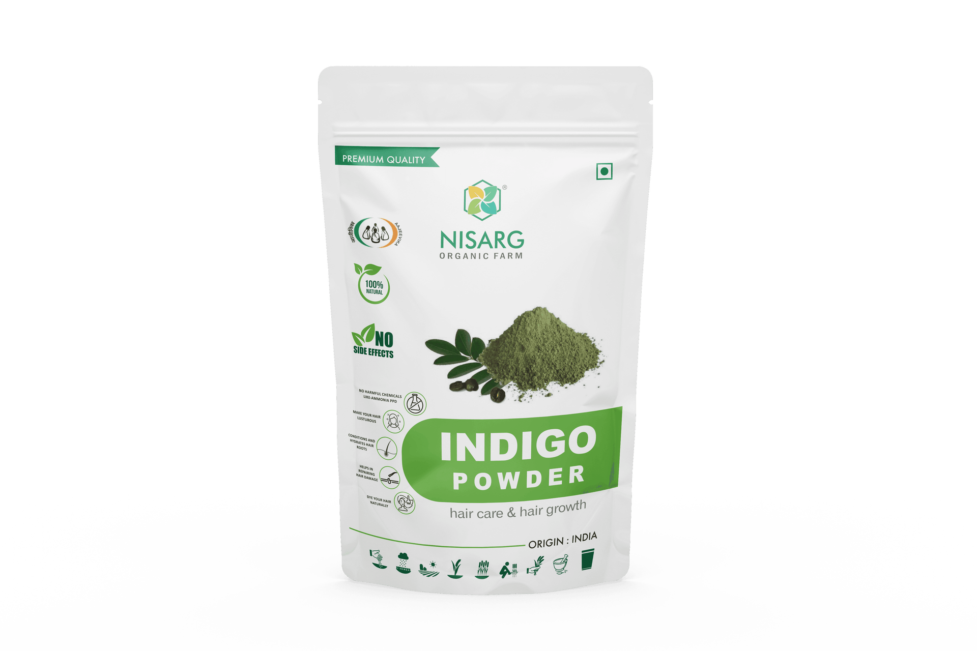 Nisarg Organic Farm Indigo Leaves Powder is a natural and herbal hair dye to color your hair black. It helps prevent premature greying of hair and dandruff. It can be used with mehendi to get brown to black on shade hair. It provides beautiful healthy colours when used alone or in combination with mehendi.