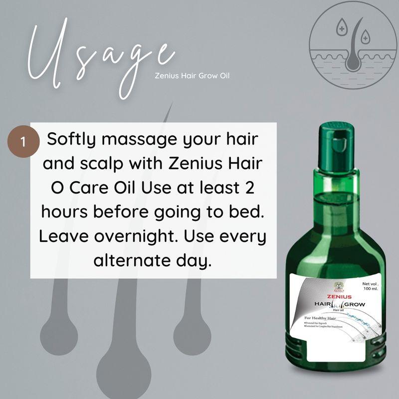 • Softly massage your hair and scalp with Zenius Hair Grow Oil Use at least 2 hours before going to bed. Leave overnight. Use every alternate day.