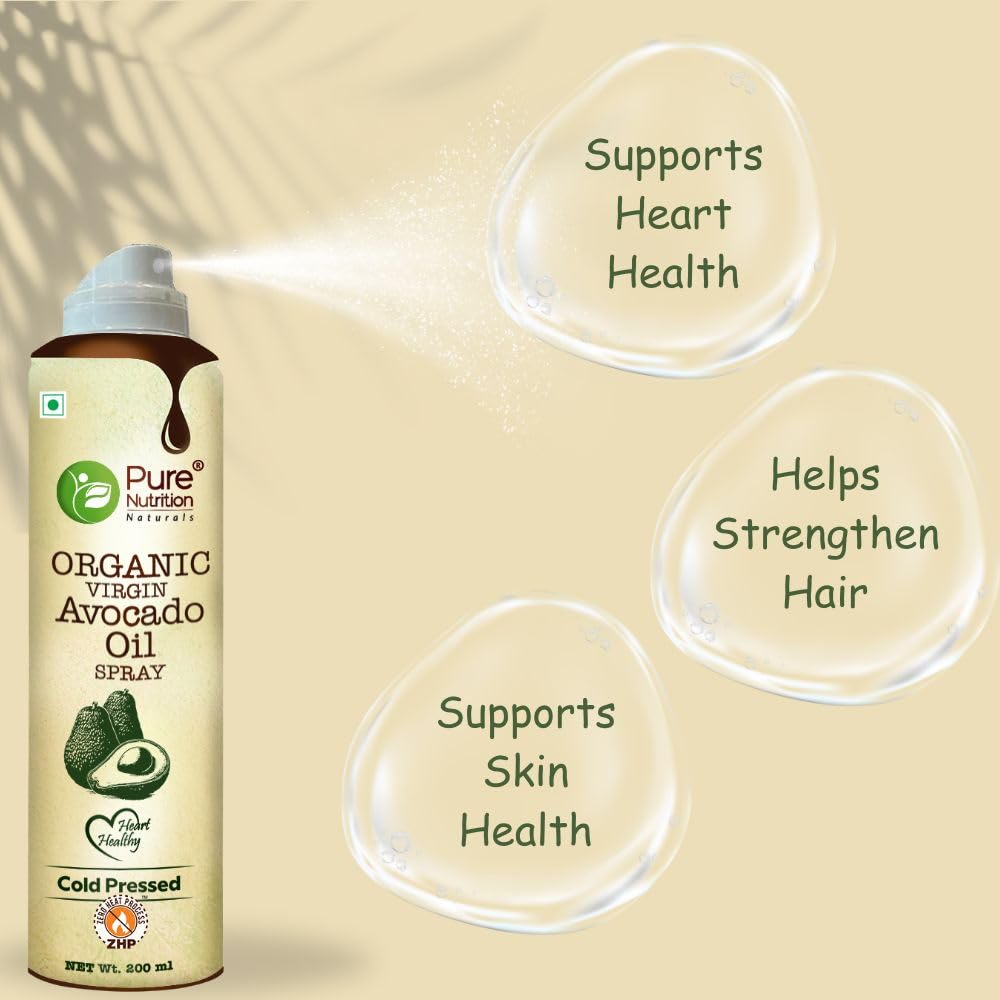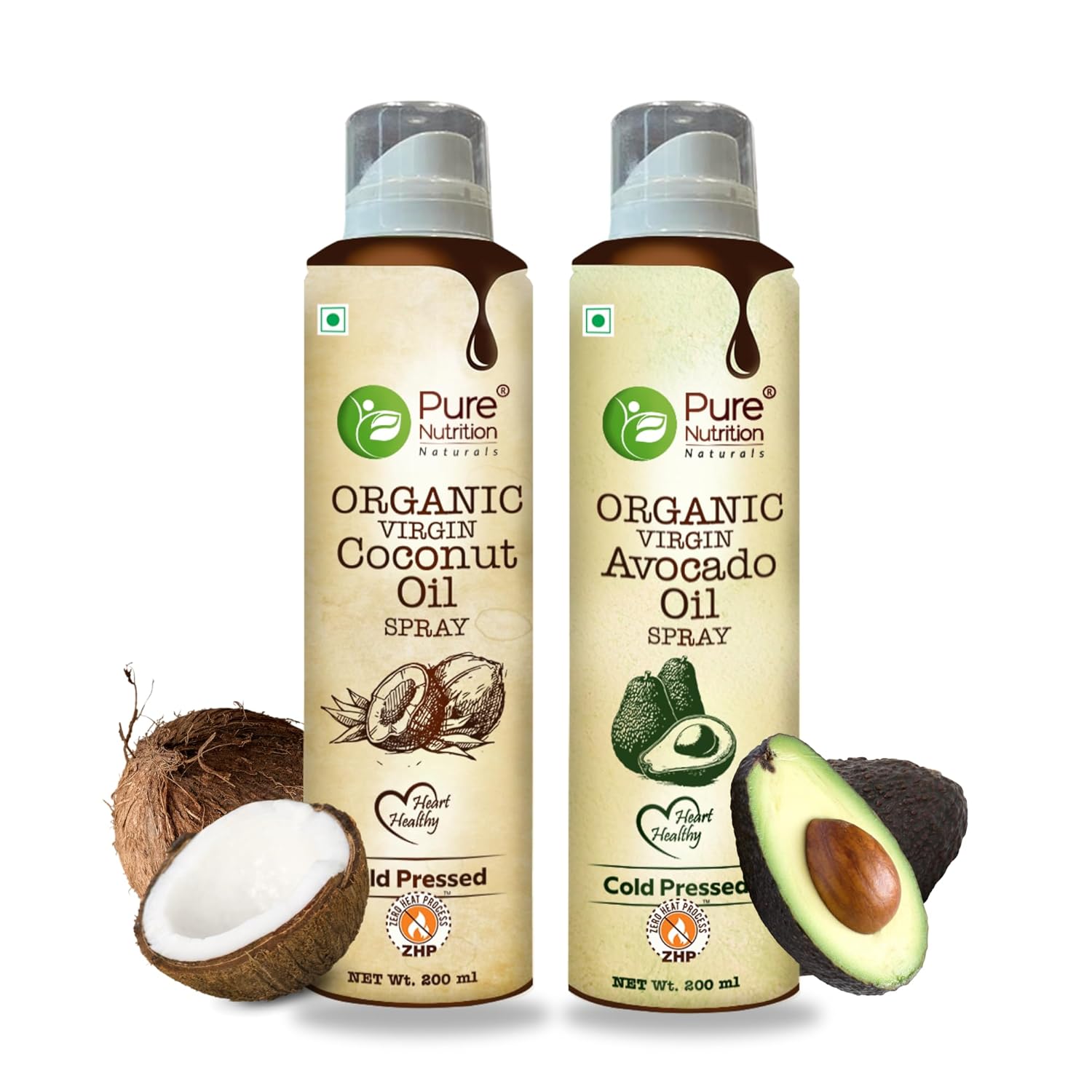 - Pure Nutrition Combo Pack Of Virgin Coconut Oil & Avocado Oil Cooking Spray 200ml |100% Organic | Low Calorie Cooking - 10X LESS Oil | For Cooking, Dressing, Sauteing, Baking & Frying | Good for Skin