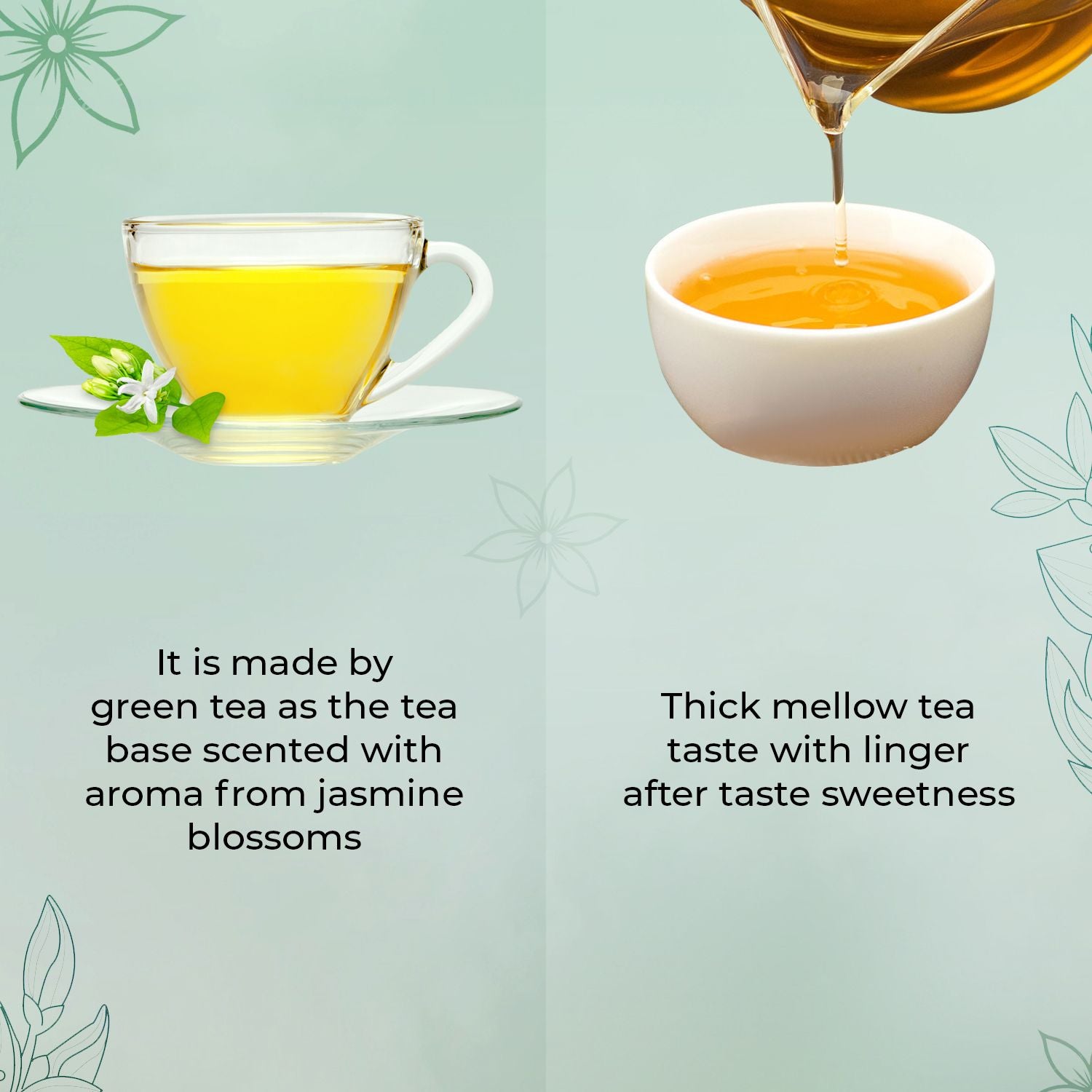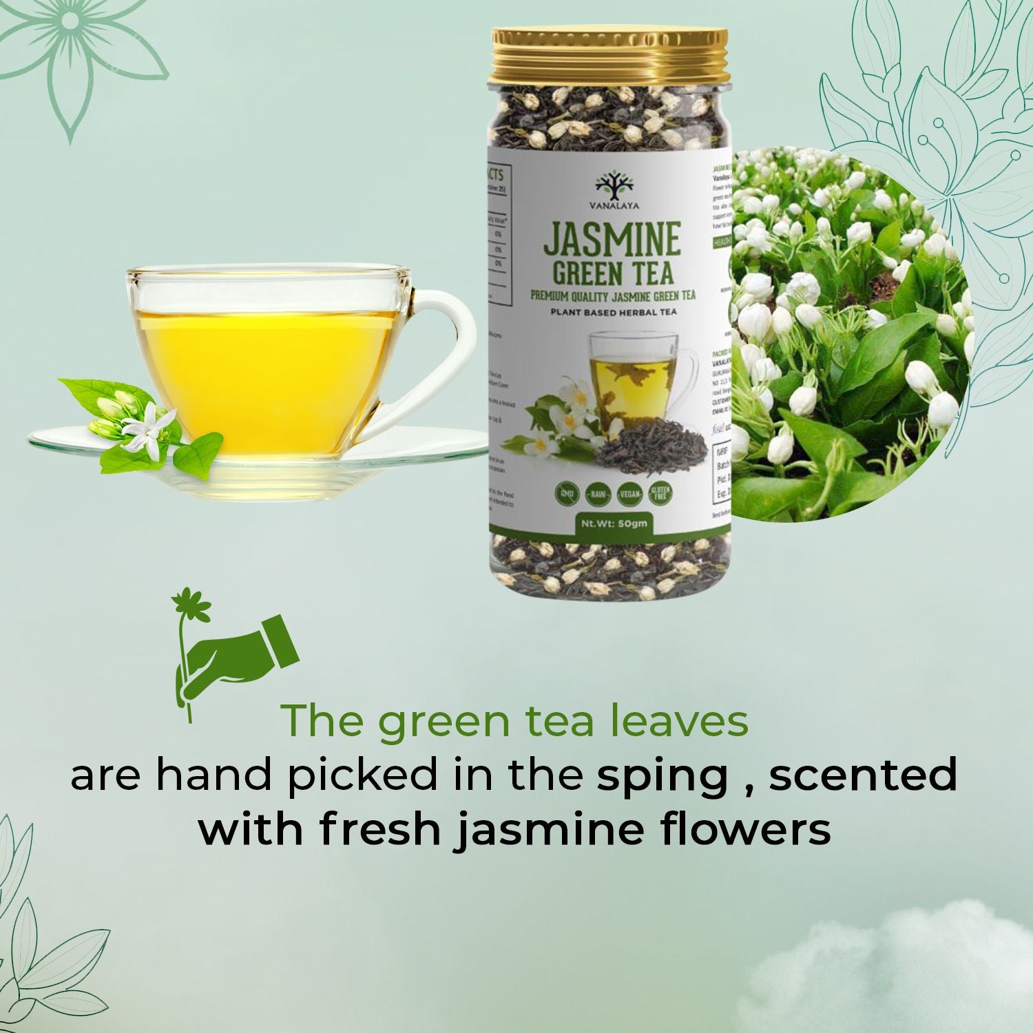 Vanalaya Jasmine green tea is pure and natural refreshing green tea lightly scented with jasmine flowers for a delicate fragrance. Pure green tea expertly blended and infused with real jasmine flowers to deliver a fragrant tea with a unique floral aroma and taste. This green tea is produced in the traditional way. After plucking, freshly picked jasmine flowers are added to the tea and left overnight to infuse. In the morning the jasmine flowers are removed, but the lovely fragrance of jasmine remains on the tea. The tea contains catechins which have fat burning properties and thus aid in weight loss. Sourced from the purest organic tea leaves, herbs and flowers straight from nature, no compromise - no natural or artificial flavours. This process uses freshly picked jasmine flowers and layering them with the green tea so it can absorb the jasmine aroma.