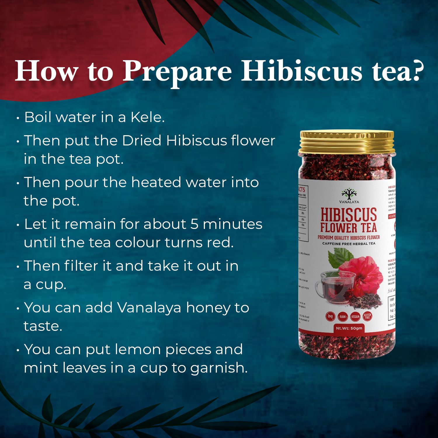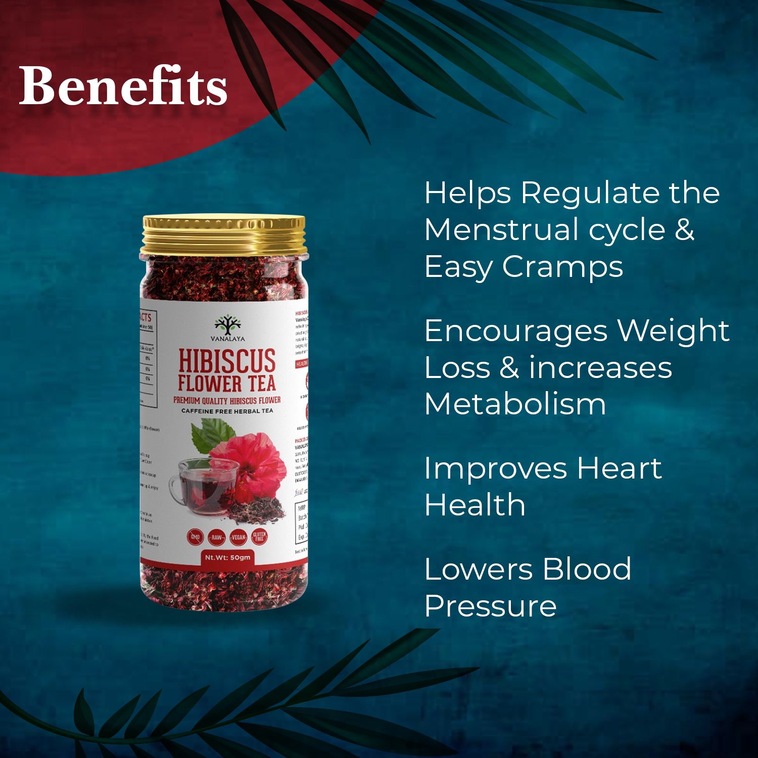 Vanalaya Organic Hibiscus Flower Tea is delightfully refreshing with a subtle fruity flavour. Hibiscus tea, made from dried parts of the hibiscus plant, is deep red in colour. It has sweet and tart flavours, similar to cranberry, and may be consumed hot or iced. It is made from dried brightly coloured hibiscus flowers. Hibiscus tea is a natural source of antioxidants, is rich in vitamin C. The bright, slightly tart taste of hibiscus produces an uplifting sensation that will leave you feeling restored and Fresh. Hibiscus Tea can be enjoyed both hot and cold, making it perfect for a refreshing summer iced tea or a winter tea to warm you up