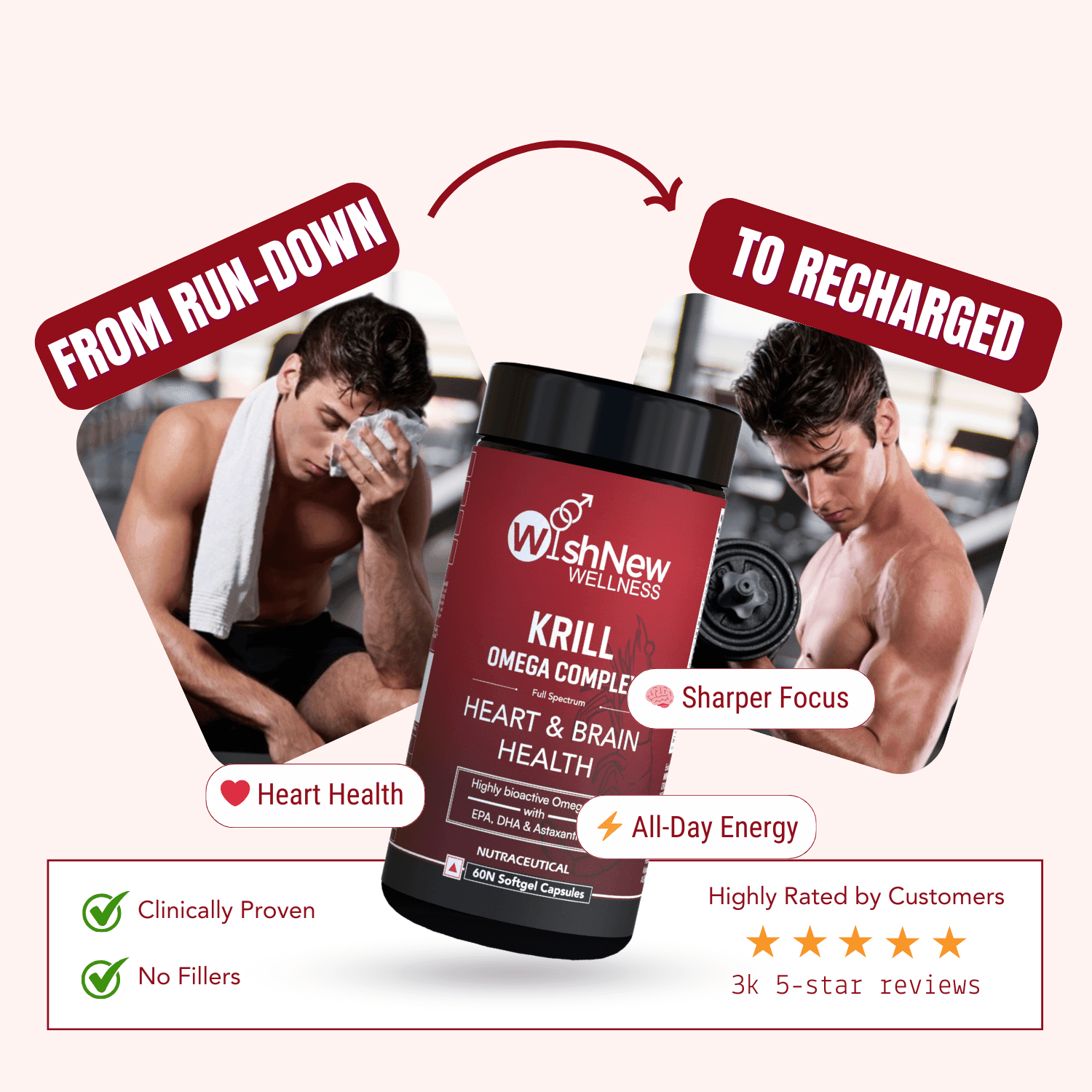 Wishnew Wellness Krill Omega Complex Heart & Brain Health Softgel Capsules is a heart-healthy formula enhanced with astaxanthin, providing superior absorption and bioavailability compared to traditional fish oils. It helps support cardiovascular health, cognitive function, and joint flexibility.