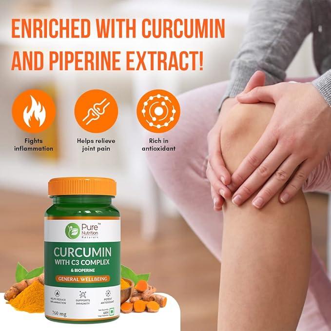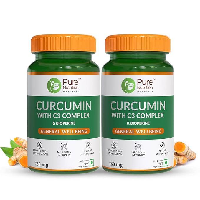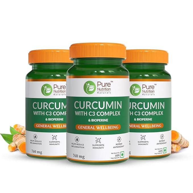 Pure Nutrition Curcumin with C3 Complex 760 mg Veg Capsule is a dietary supplement formulated with curcumin, piperine and amla extract that can boost immunity and joint health. It is rich in antioxidants that protect against free radicals and help boost immunity. It has antioxidant and anti-inflammatory properties that can help promote heart health and lower high cholesterol levels.
