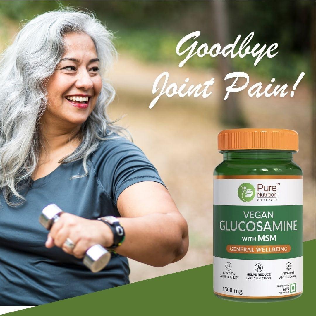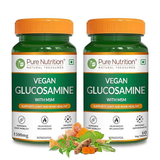 Pure Nutrition Vegan Glucosamine with MSM 1500 mg Veg Tablet is a dietary supplement that provides nutritional support for healthy connective tissues. It is formulated with glucosamine hydrochloride, boswellia serrata and MSM, supporting healthy joints. It can also reduce pain and inflammation associated with joint problems.