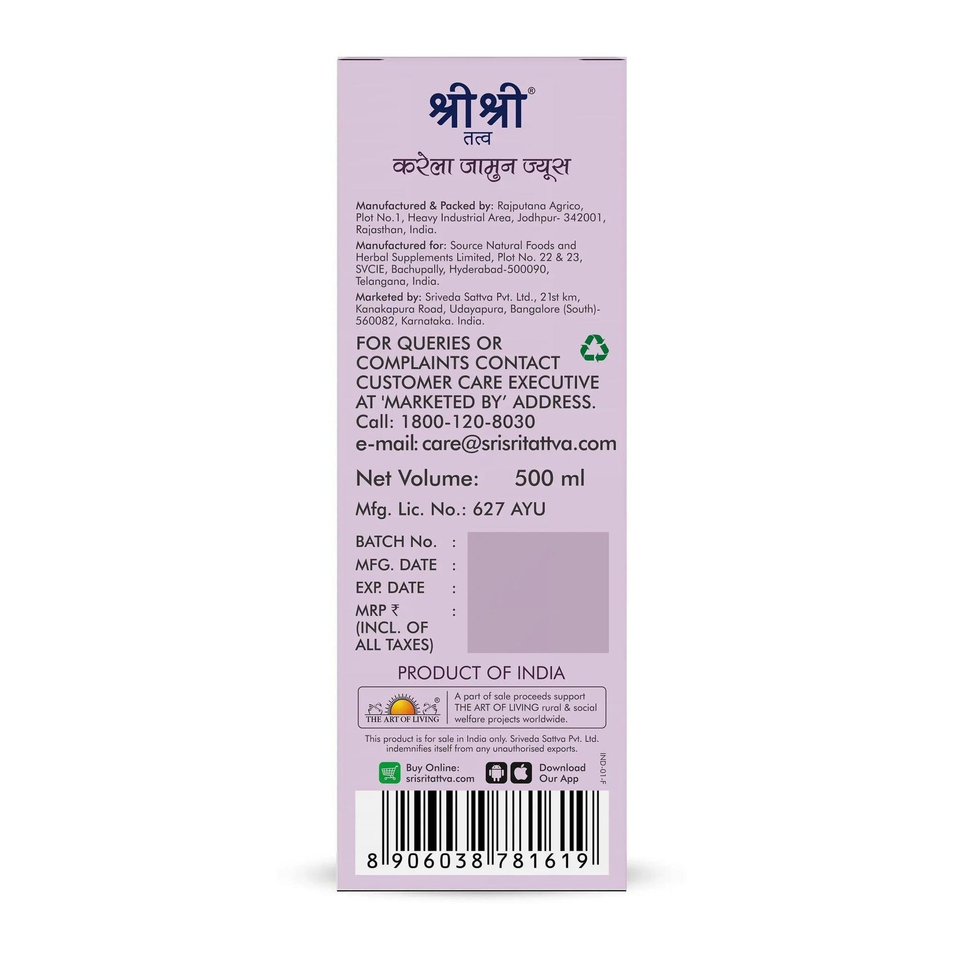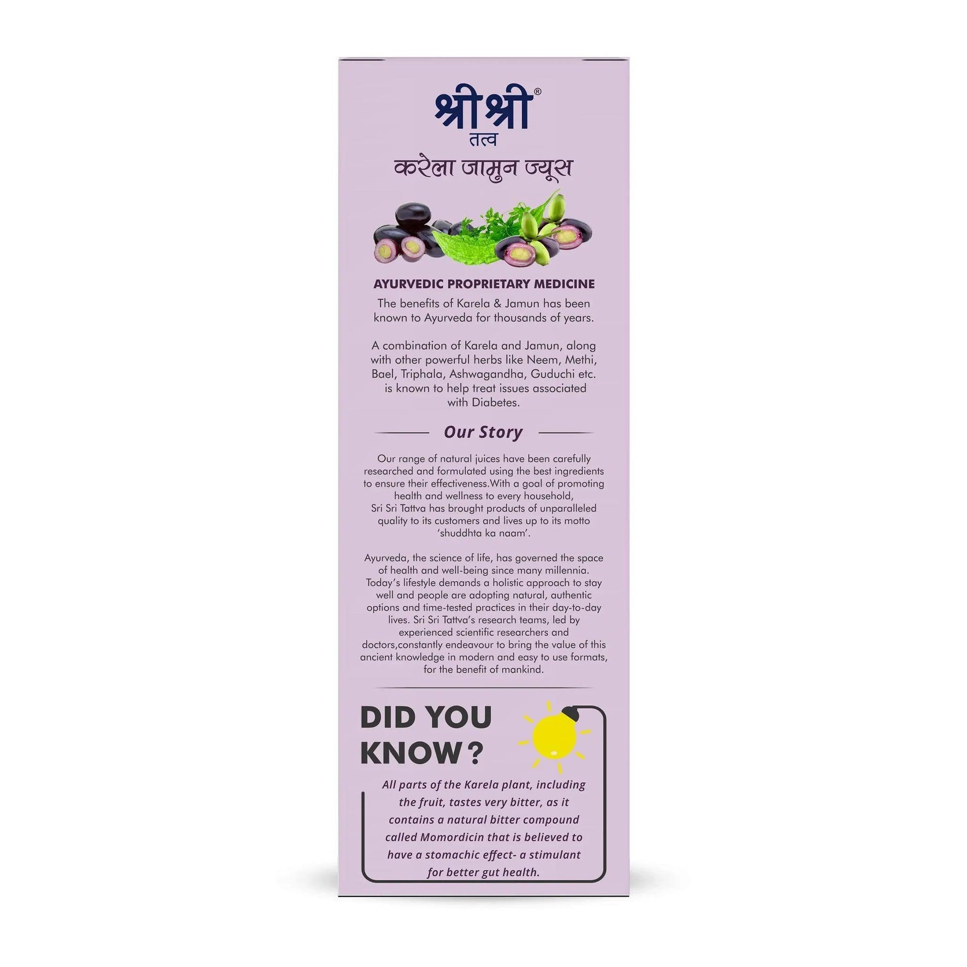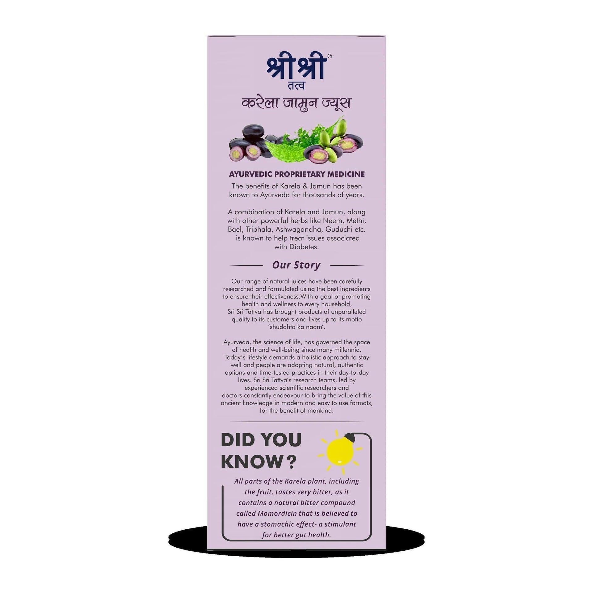 - Sri Sri Tattva Karela Jamun Juice is believed to support overall digestion and maintain a healthy digestive system. It may aid in digestion, promote bowel regularity, and alleviate digestive issues