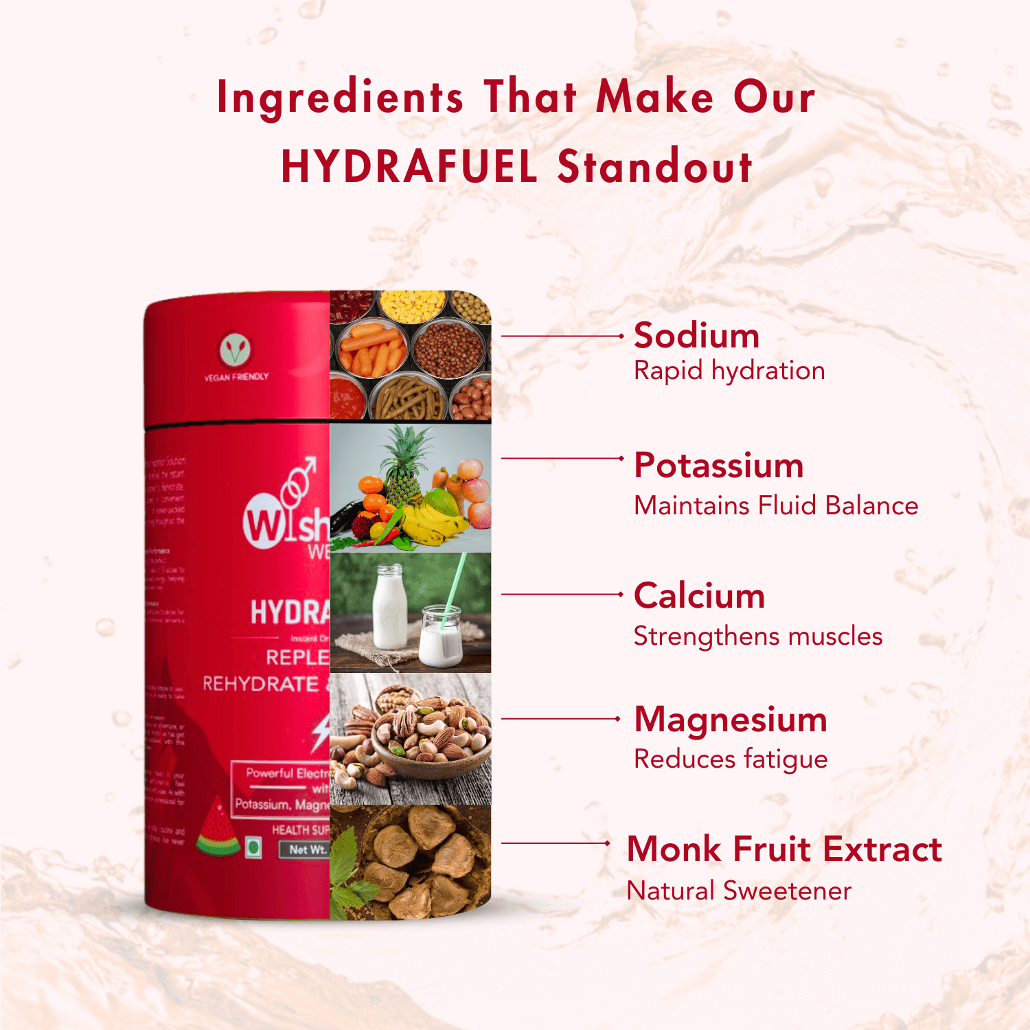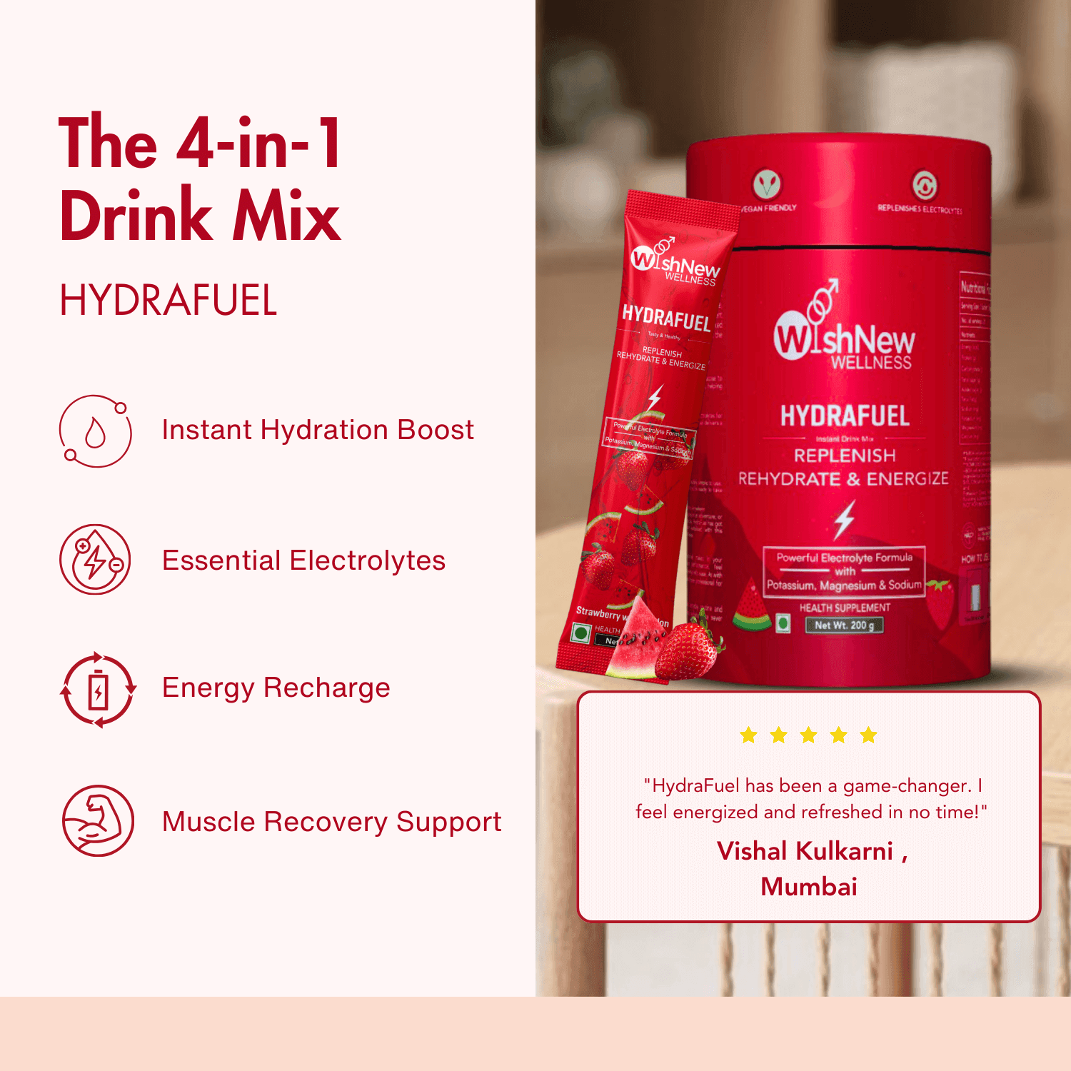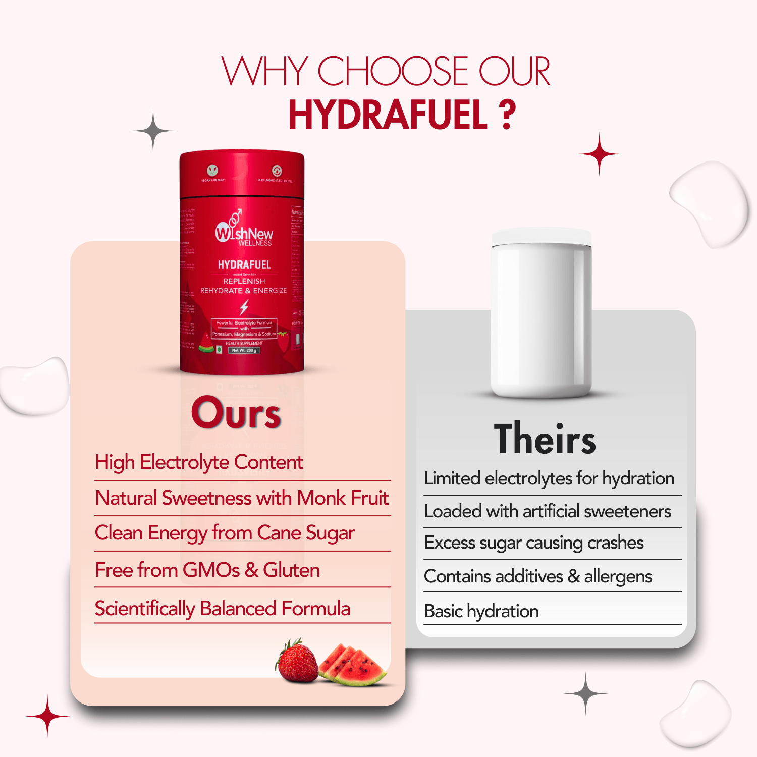 WishNew Wellness Hydrafuel Instant Energy Drink Mix Sachet Strawberry & Watermelon is an advanced hydration solution packed with essential electrolytes. Its balanced formula is designed to potentially help replenish and rehydrate your body while providing a natural energy boost. This product is particularly suitable for athletes, fitness enthusiasts, or anyone looking to maintain hydration during physical activity or busy days.