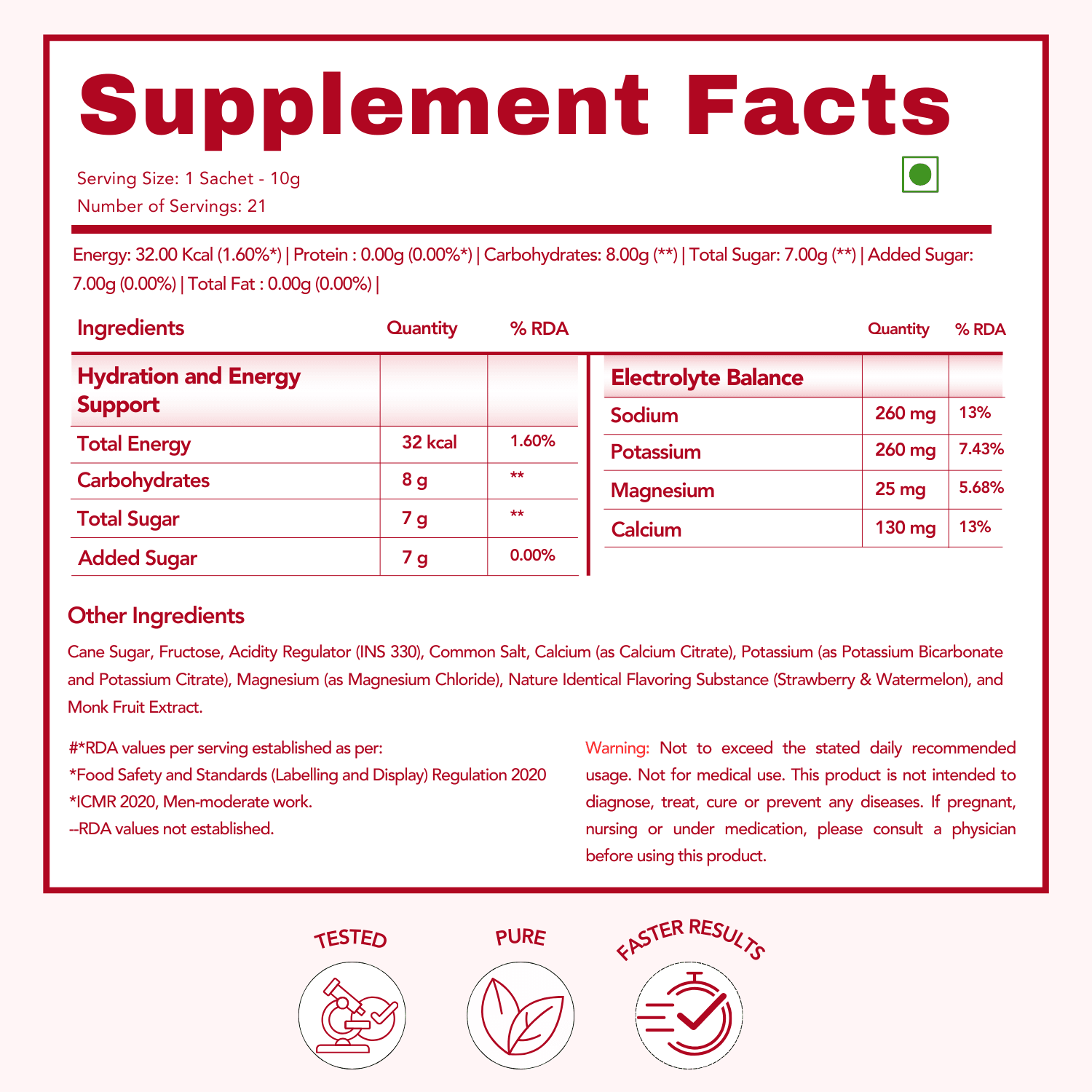 - Each serving (10 gram) contains: Cane Sugar, Fructose, Acidity Regulator (INS 330), Common Salt, Calcium (as Calcium Citrate), Potassium (as Potassium Bicarbonate and Potassium Citrate), Magnesium (as Magnesium Chloride), Nature Identical Flavoring Substance (Strawberry and Watermelon), Monk Fruit Extract.