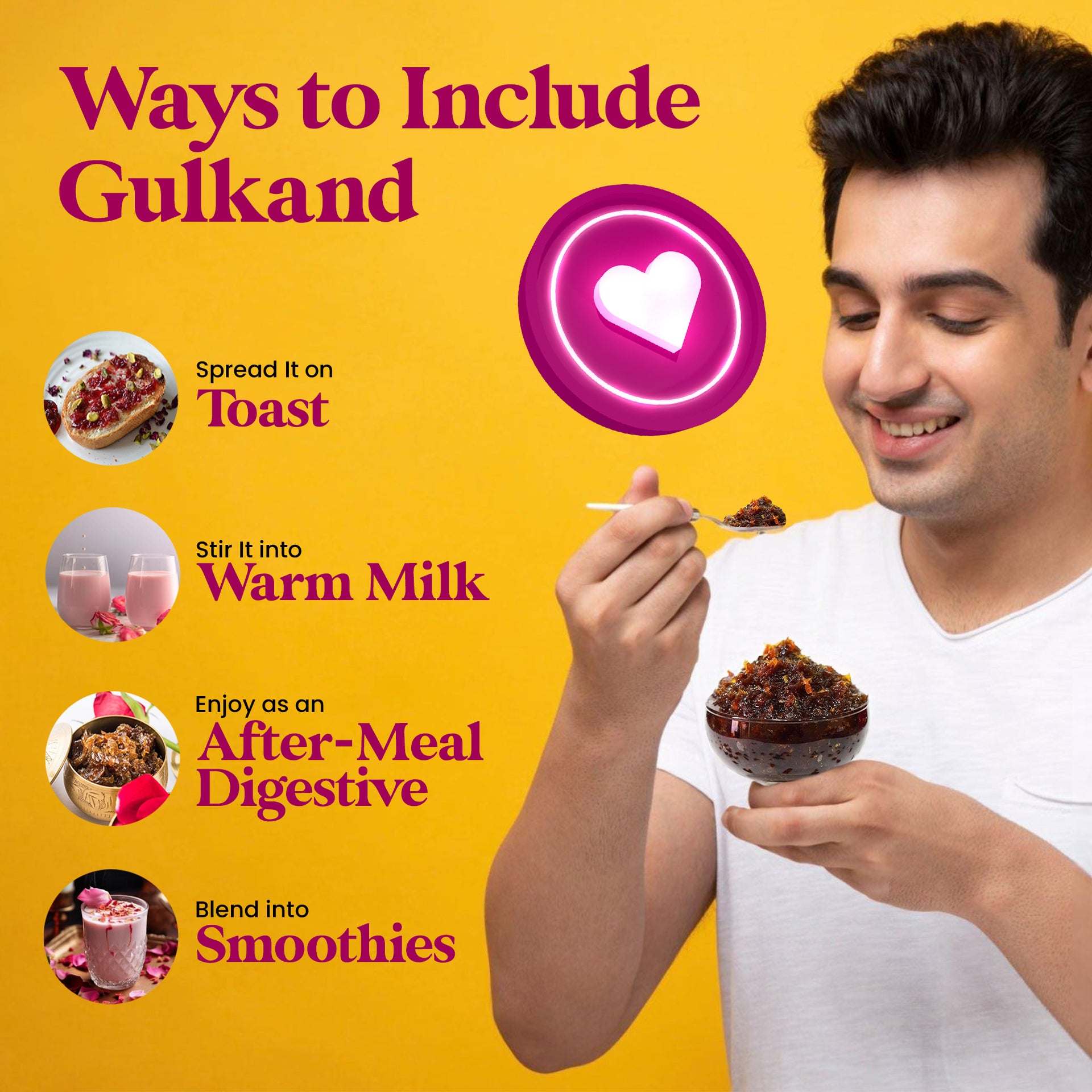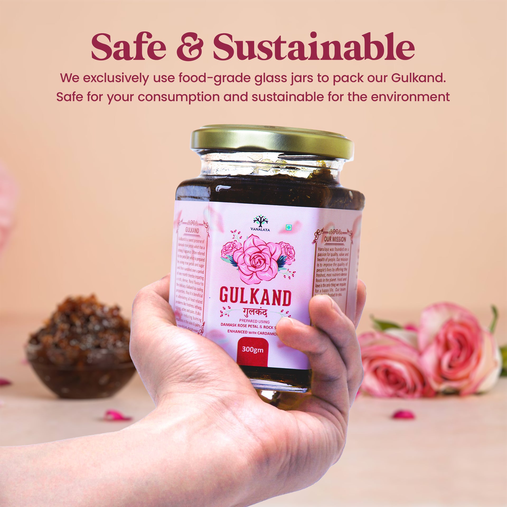 Vanalaya Natural Organic Gulkand is one of the most delicious Ayurvedic preparations known to mankind. Gulkand is a sweet preserve of rose petals and is made primarily of rose petals, which are collected at their peak. Place the rose petals and sugar in layers in a wide-mouthed airtight glass jar. Gulkand is a sweet preserve of damask rose petals which has a strong fragrance. Often referred to roe petal jam which is prepared by using rose petals and sugar and then sundried over a period of one month thereby imparting a rich, dense, floral flavour to the delicacy.