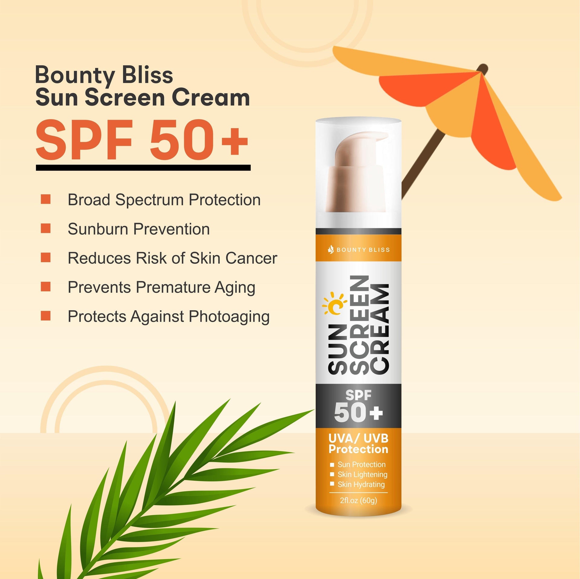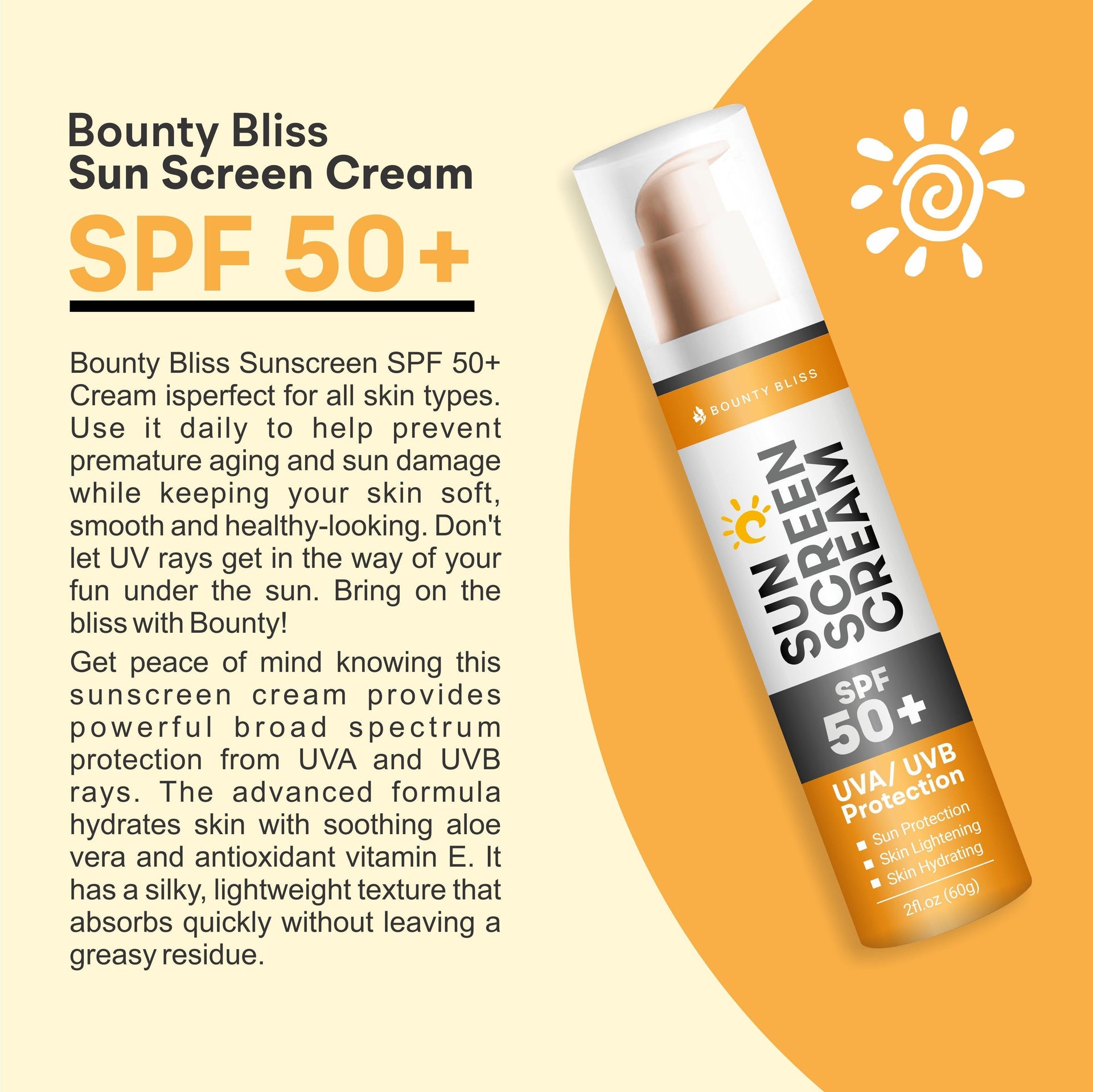 Bounty Bliss Sunscreen SPF 50+ Cream lets you enjoy the sunshine without worry. Use it whenever you're outdoors to prevent sunburns, early skin aging, and skin cancer. Now you can embrace summer with healthy, protected skin. Get powerful sun protection with a nourishing touch - try Bounty Bliss today!