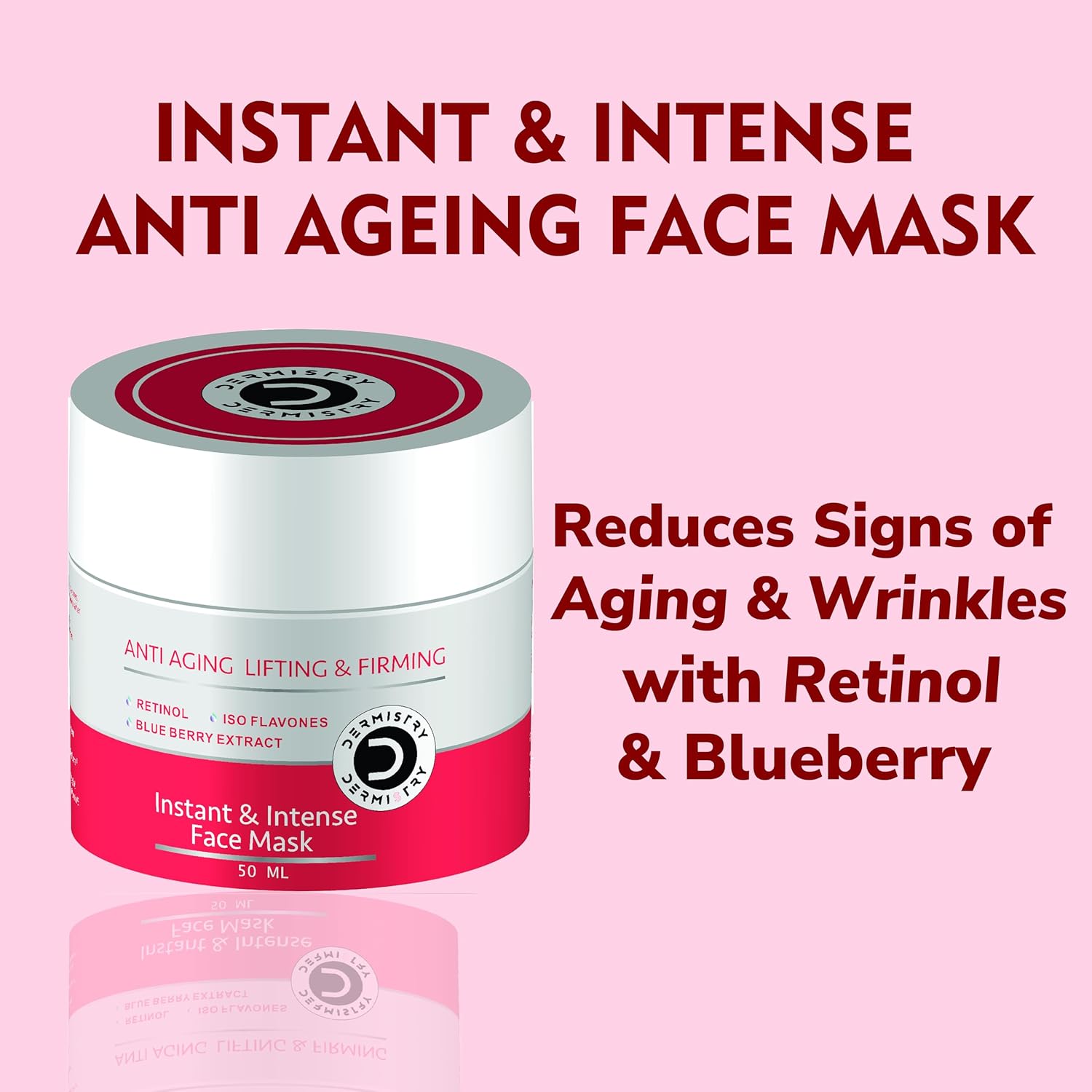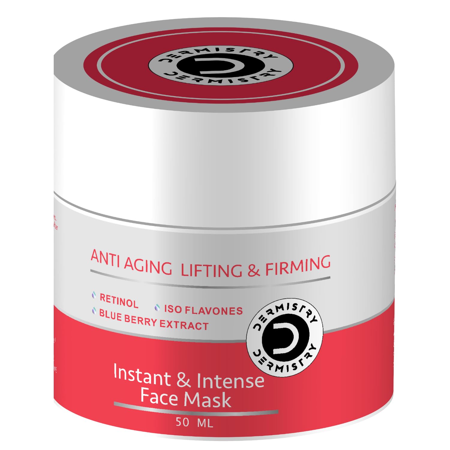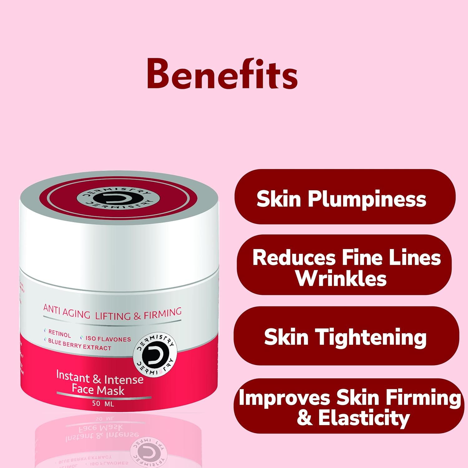 Dermistry Anti Aging Lifting and Firming Instant and Intense Face Mask - Say hello to a younger you with the anti-ageing lifting and firming instant and intense face mask. This mask is formulated with the virtuousness of two award-winning constituents that boost collagen production, reduce fine lines and wrinkles, minimize pores and fade dark spots. Rich in antioxidants, it leaves your face feeling smooth and firm.