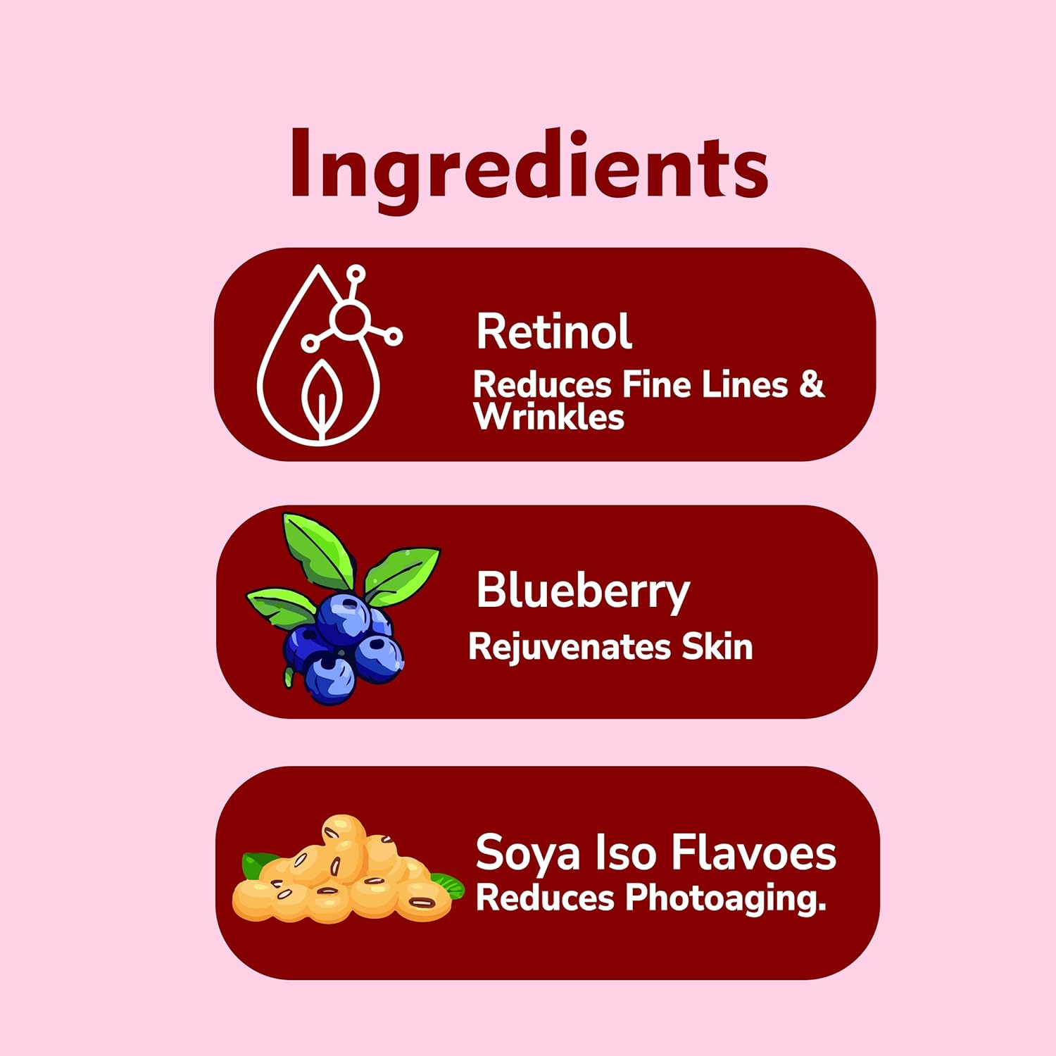 Retinol fights the signs of ageing, manages age spots, stimulates collagen and clears pores. Blueberry is an anti-ageing warrior that boosts longevity. It's rich in antioxidants and fights dangerous revolutionaries. This berry is also loaded with other nutrients.