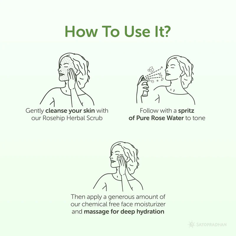 Gently cleanse your skin with our Rosehip Herbal Scrub. Follow with a spritz of Pure Rose Water to tone, then apply a generous amount of our chemical-free face moisturizer and massage for deep hydration.
