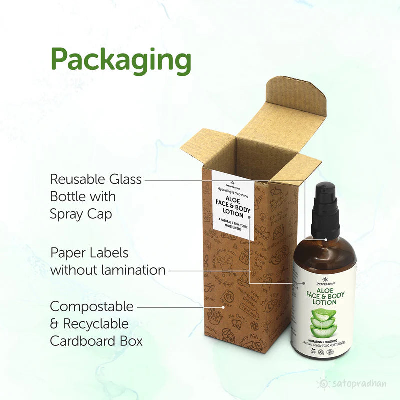 Satopradhan Aloe Face & Body Lotion - A natural & non-toxic face moisturizer that strengthens and nourishes your skin's natural barrier, locking in moisture for deep hydration and protection against dryness. Satopradhan Aloe Body Lotion is a pH-balanced natural face moisturizer with 40% aloe vera juice for intense hydration. It is enriched with other nourishing plant-based ingredients to repair, rejuvenate and soothe your skin from within. It is lightweight and quickly absorbs into the skin, moisturising for hours.