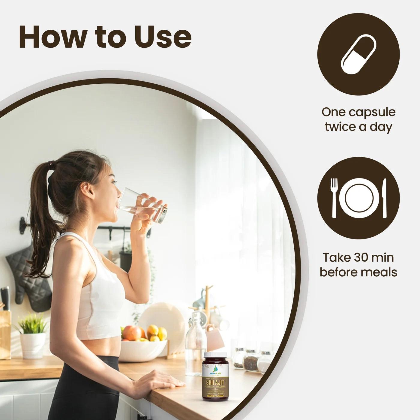 - Take 1 capsule of Vedapure Raw Shilajit half an hour later. For best results, take capsules twice a day