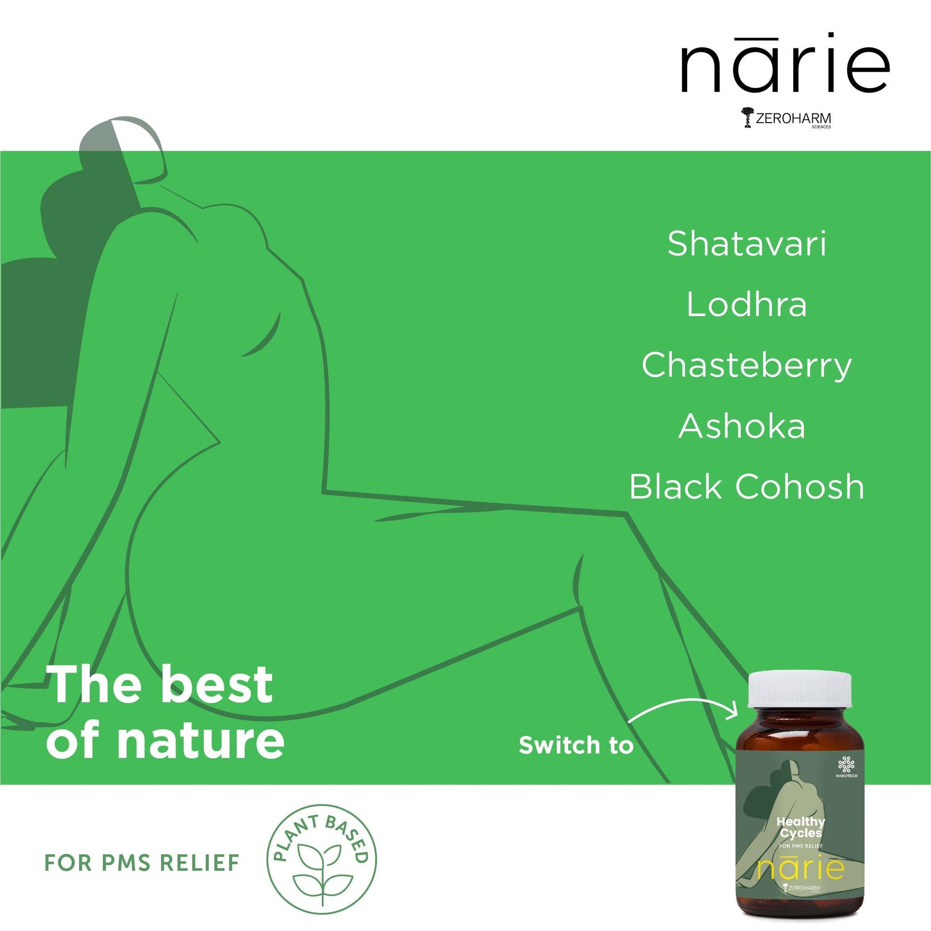 Zeroharm Sciences Narie Healthy Cycles Tablet is formed with a precision nutraceutical that combines the power of shatavari, Godhra, chaste berry, Ashoka, and black cohosh for restoring hormonal balance, regularising cycles, preventing excessive flow, reducing pain, and enhancing overall menstrual health.