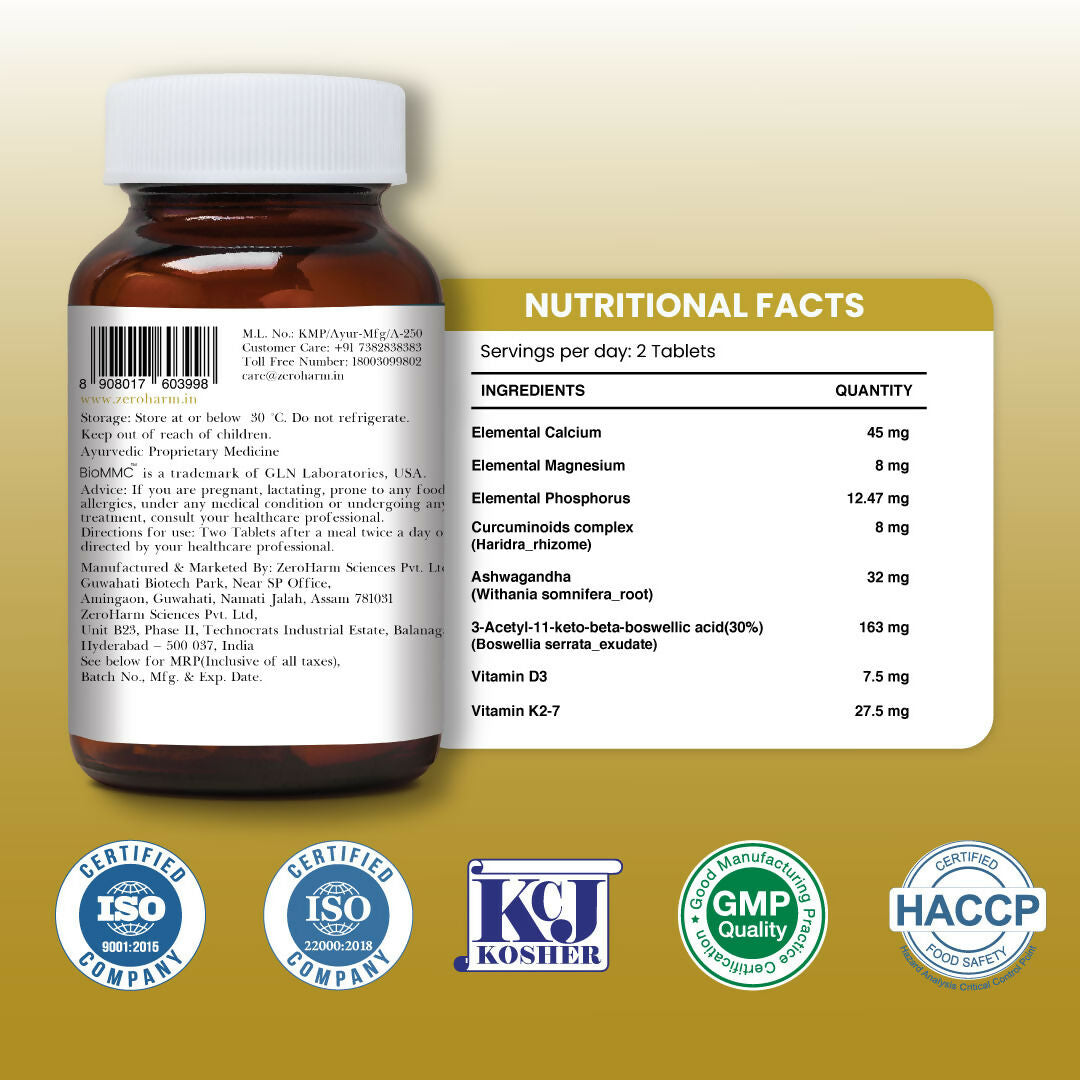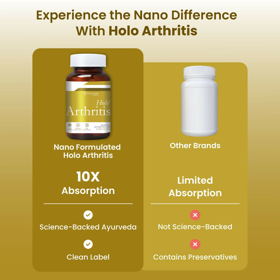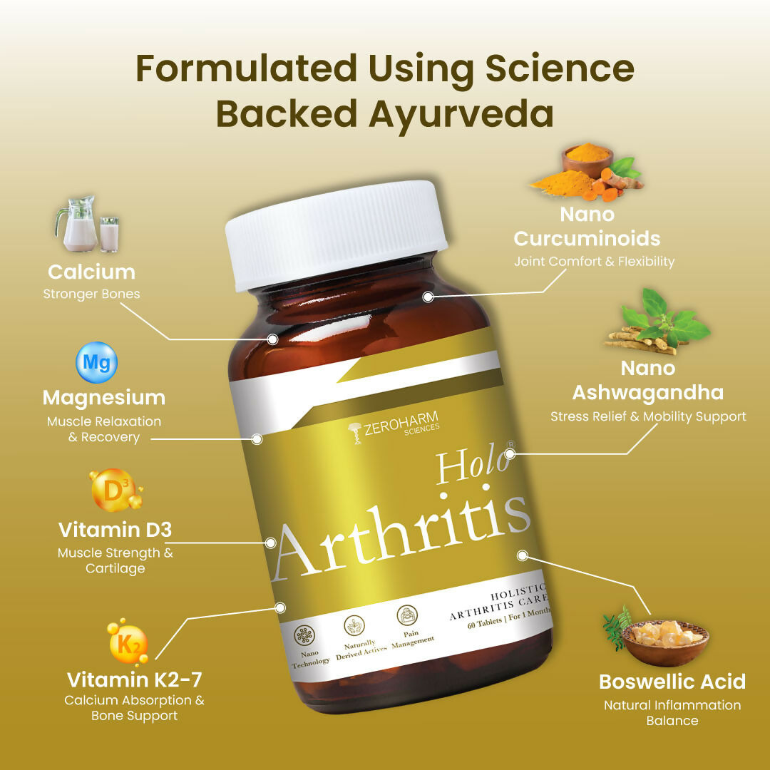Zeroharm Sciences Holo Arthritis Tablet can provide the goodness of natural extracts like curcumin, ashwagandha, and Boswellia along with a full spectrum of milk-based supportive minerals like calcium, magnesium, phosphorous, and vitamin d3, k2 working synergistically to offer holistic arthritis care, with no side effects. The advanced nano-formulated actives of natural extracts, nano calcium extracted from milk along with the minerals and plant-based vitamins can ensure higher efficacy and therapeutic results even with a much lower dosage.