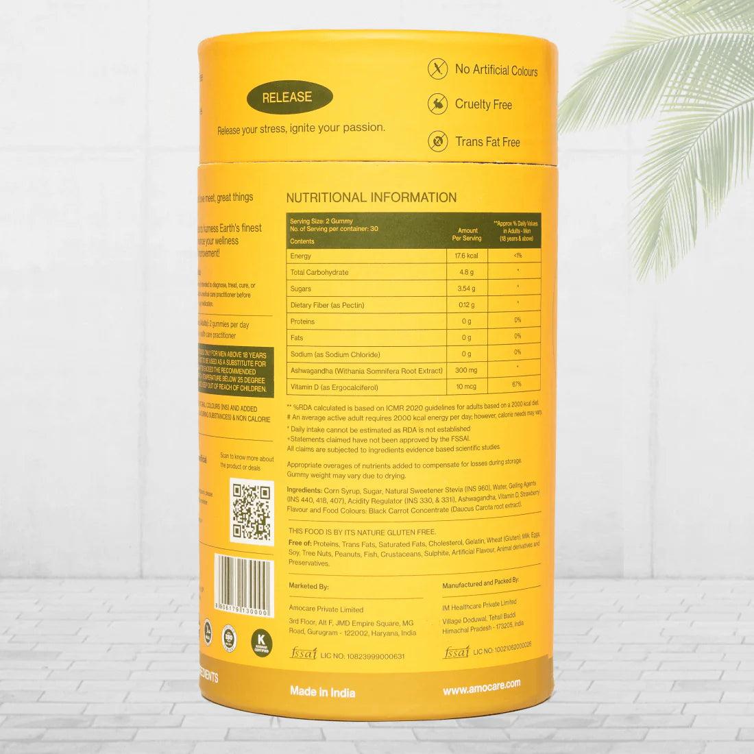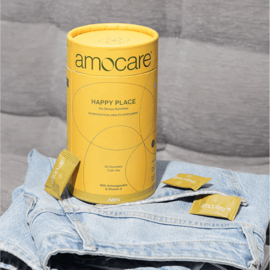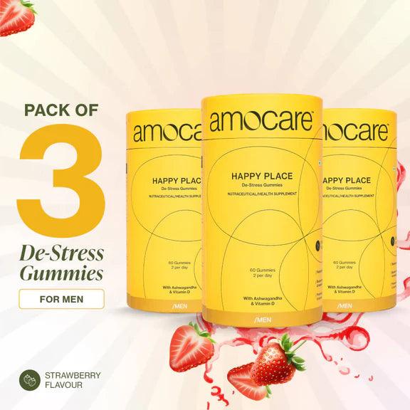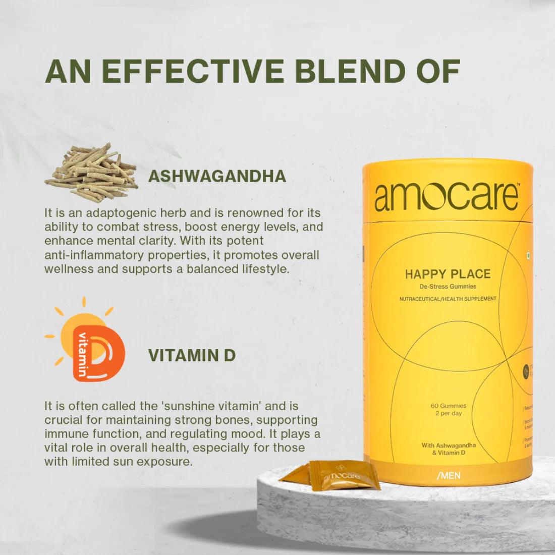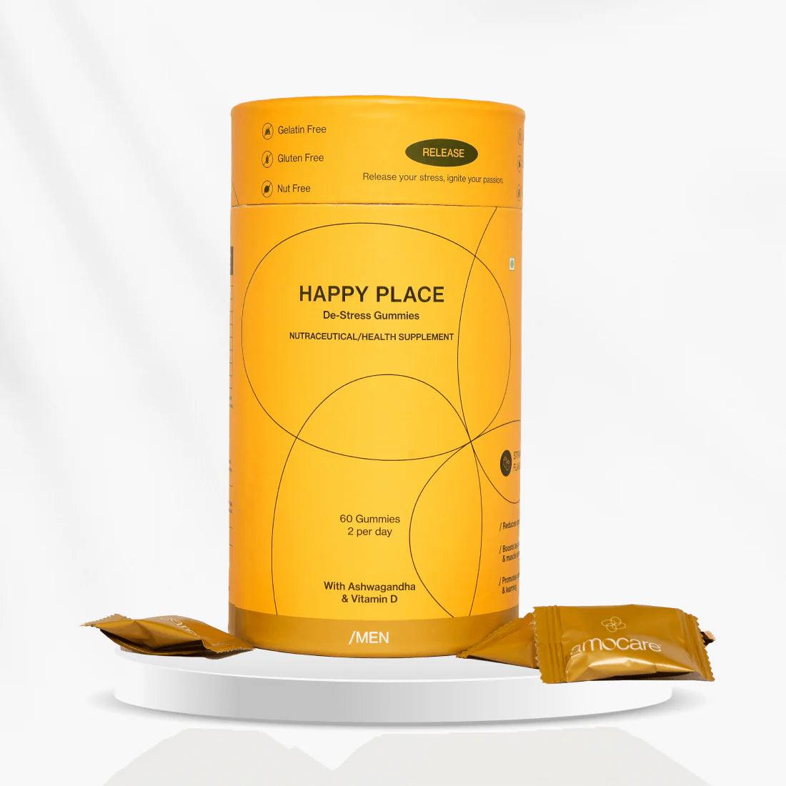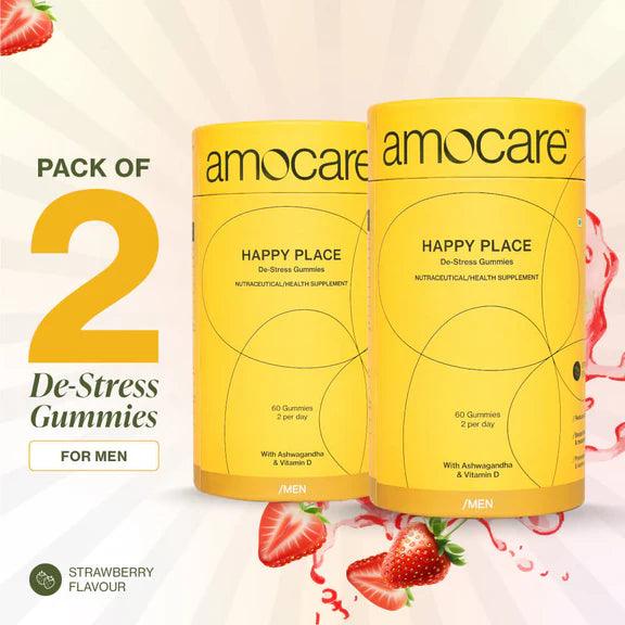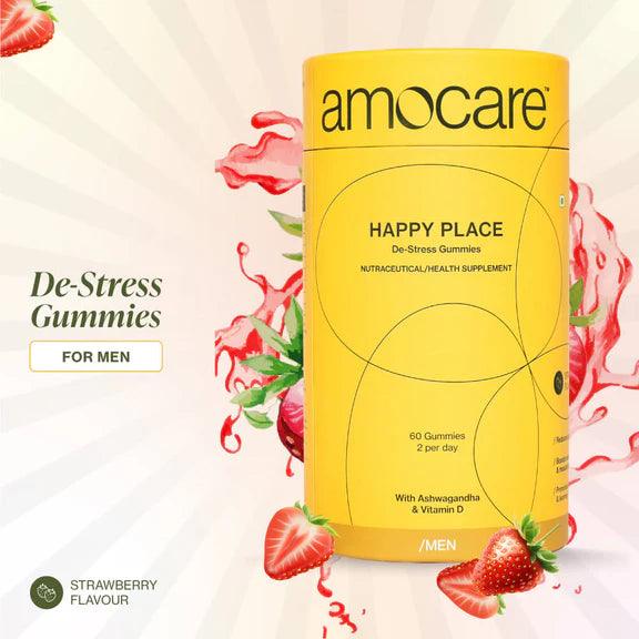 Amocare Happy Place Dew Stress Gummies for Men Crafted with natural ingredients such as Ashwagandha and Vitamin D, Happy Place Men gummies are a healthy way to destress your worries away and teleport you to a happy place.