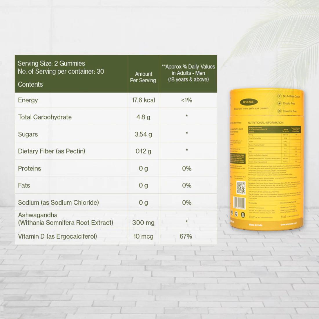 Corn Syrup, Sugar, Natural Sweetener Stevia (INS 960), Water, Gelling Agents (INS 440, 418, 407), Acidity Regulator (INS 300 & 331), Ashwagandha, Vitamin D, Strawberry Flavour, Food Colour, Black Carrot Concentrate (Daucus Carota Root Extract)