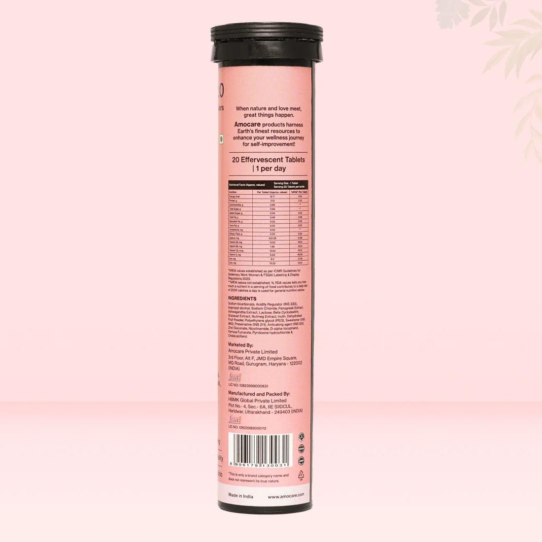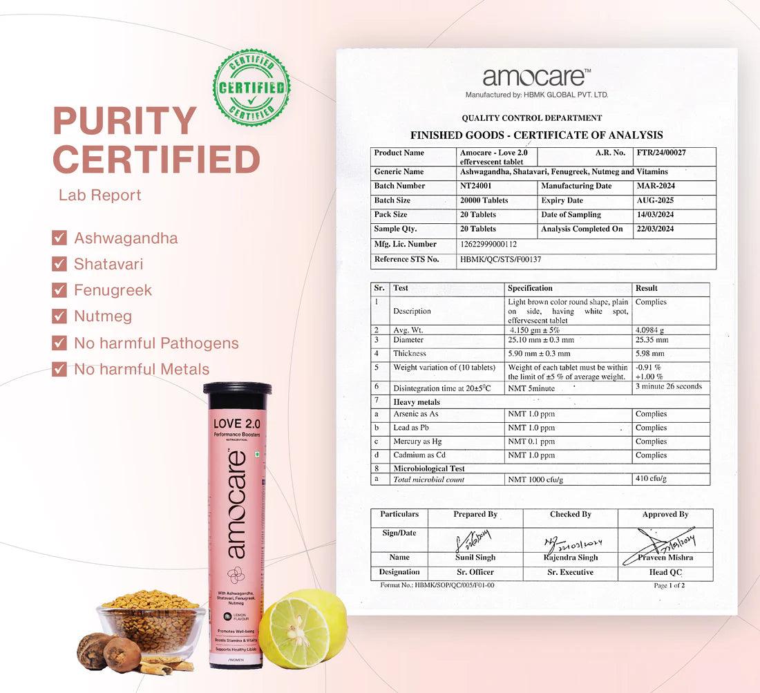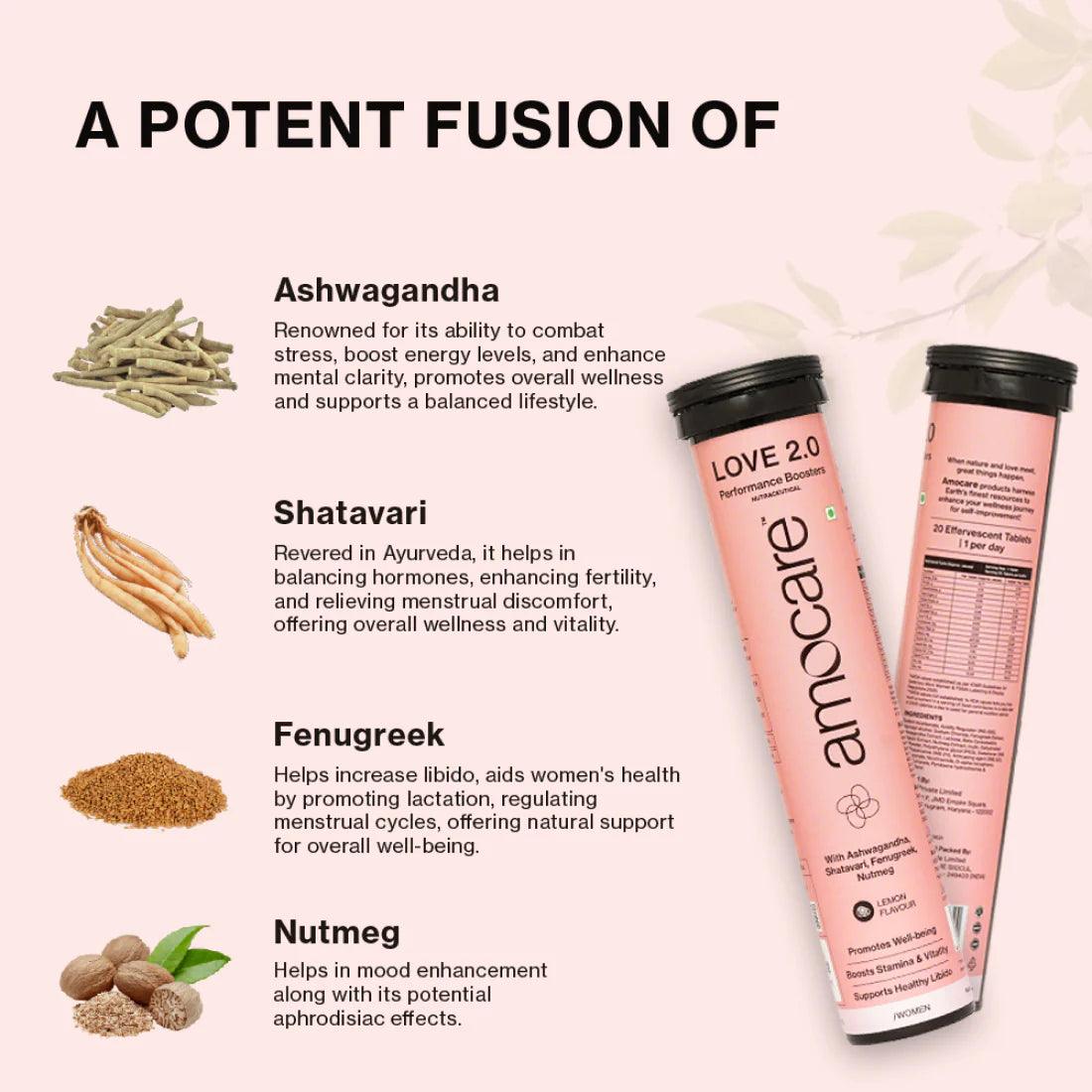 Amocare Love 2.0 Effervescent Tablet Stuffed with an abundance of pure, natural plant-based elements that include Ashwagandha, Shatavari, Fenugreek and Nutmeg, Love 2.0 is meticulously crafted for women to support healthy libido, promote well-being and boost stamina and vitality.