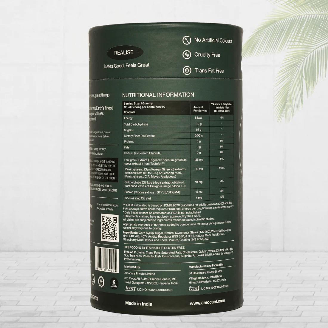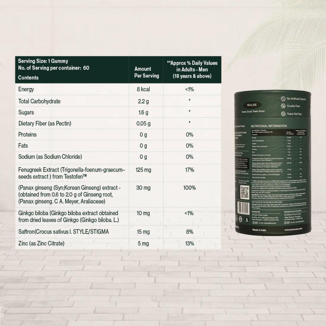Fenugreek Extract, Panax Ginseng, Ginkgo Biloba, Saffron, Zinc, Corn Syrup, Sugar, Natural Sweetener, Stevia (INS 960), Water, Gelling Agents (INS 440, 418, 407), Acidity Regulator (INS 330, 331i), Natural Monk Fruit Extract, Strawberry Mint Flavour and Food Colours, Coating (INS 905e, 903)