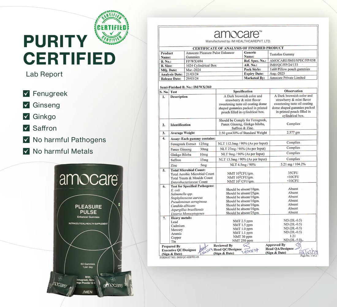 Amocare Pleasure Pulse Enhancer Gummies for Men Packed with all-natural ingredients including Fenugreek, Ginseng, Ginkgo and Saffron, Pleasure Pulse Gummies for Men help enhance desire, and excitement and lead to more intense moments between you and your partner.