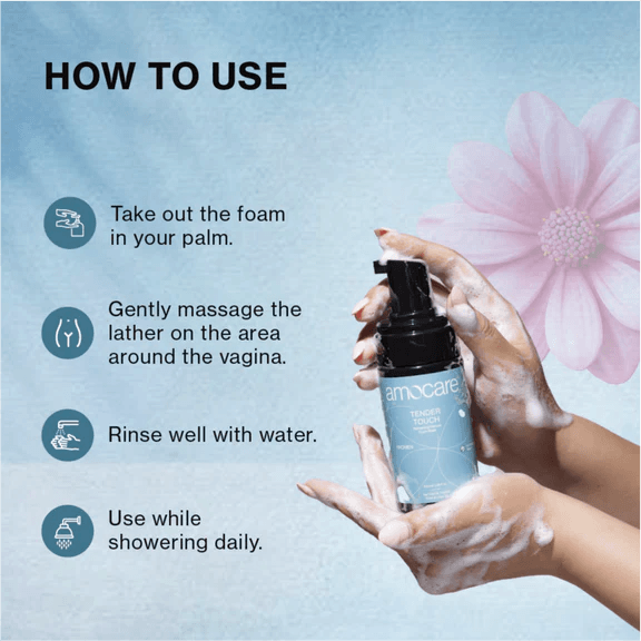 Amocare Tender Touch Intimate Wash for Women Infused with Tea Tree Oil, Thymol, Rose & Lotus Oil, Amocare's Tender Touch Intimate Foam Wash is the perfect gentle & effective solution to maintain women's Intimate Hygiene. It helps prevent infection and irriration and offers a lasting touch of natural fragrance. It acts as a Natural Moisturiser & Deodorizer. Our intimate wash is safe for daily use and is free from Paraben/ Sulphate / Silicone/ Phthalate