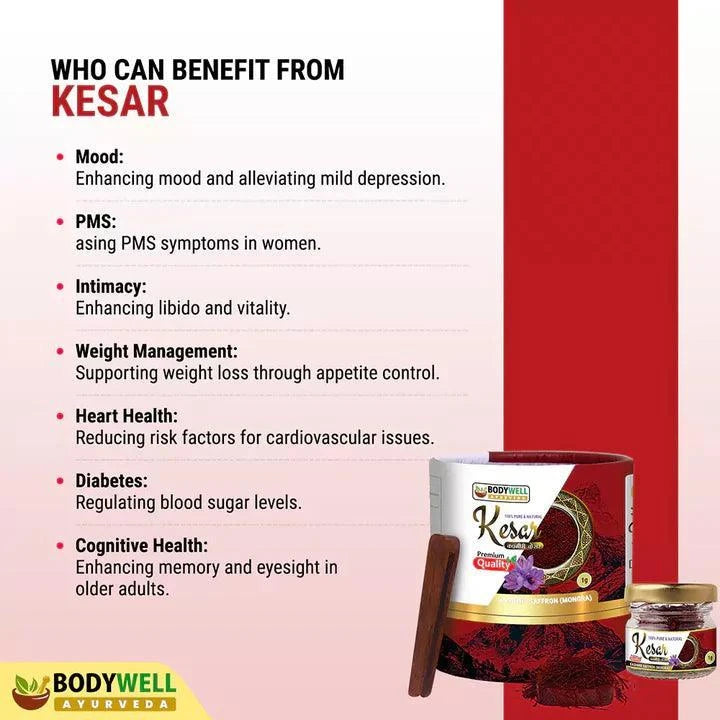 BodyWell Ayurveda Kashmir Saffron (Mongra)Saffron (Kesar) is an excellent gift for humans from nature. Kashmiri Mongra Saffron (Kesar) is the highest quality of saffron and is very popular for its intense aroma, striking red colour and delicious flavour, which makes it one of the most expensive spices in the world. Kesar is also used in various medicines especially Ayurvedic medicine for its natural health benefits and holistic purposes. Kesar helps to enhance complexion, lightens the skin tone, imparts a natural glow to your face, improves blood circulation, help to control heart rate and blood pressure.