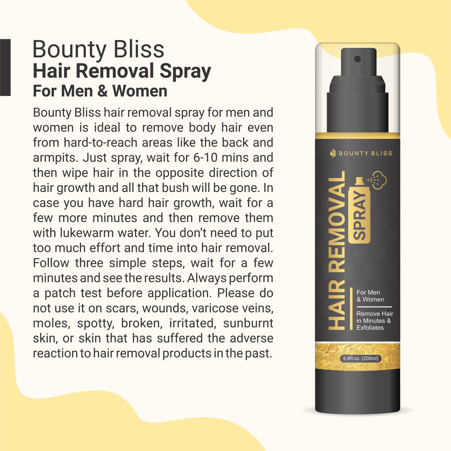 Efficiency: Bounty Bliss Hair Removal Spray For Men & Women cover large areas of the body quickly, making them efficient for removing hair from areas like the legs, arms, chest, back, and bikini line.