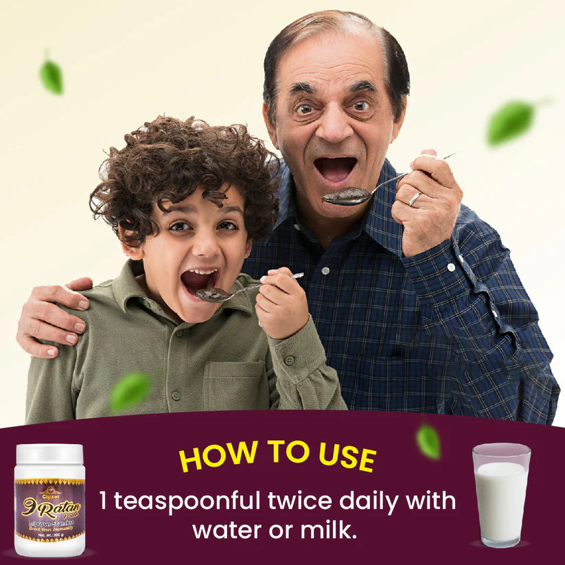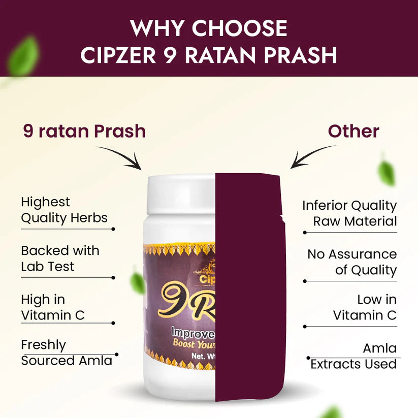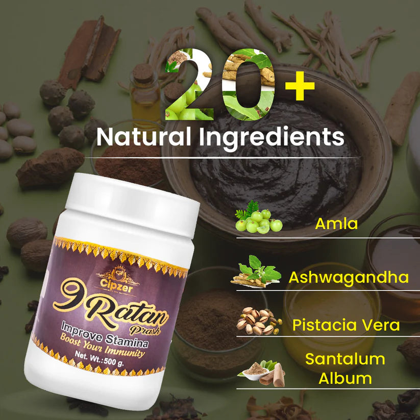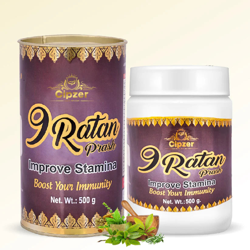 Cipzer 9 Ratan Prash is a powerful Ayurvedic formulation designed to enhance energy, stamina, and immunity. Enriched with nine potent herbal ingredients, this health supplement revitalizes the body, combats fatigue, and strengthens the immune system. It is an ideal choice for individuals seeking to improve their overall well-being, especially during seasonal changes or times of physical exertion.