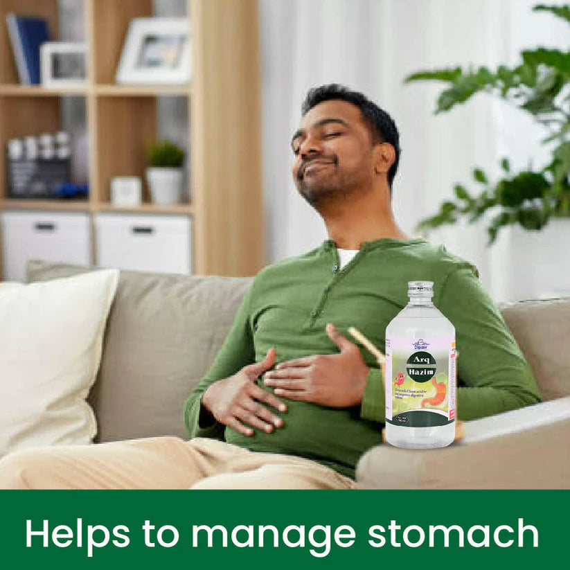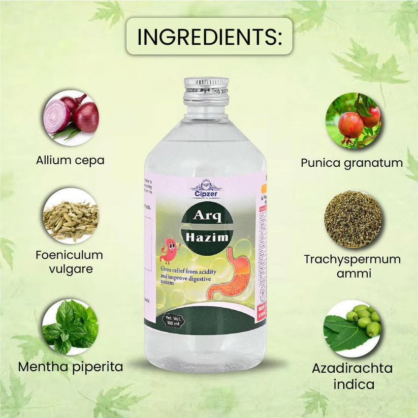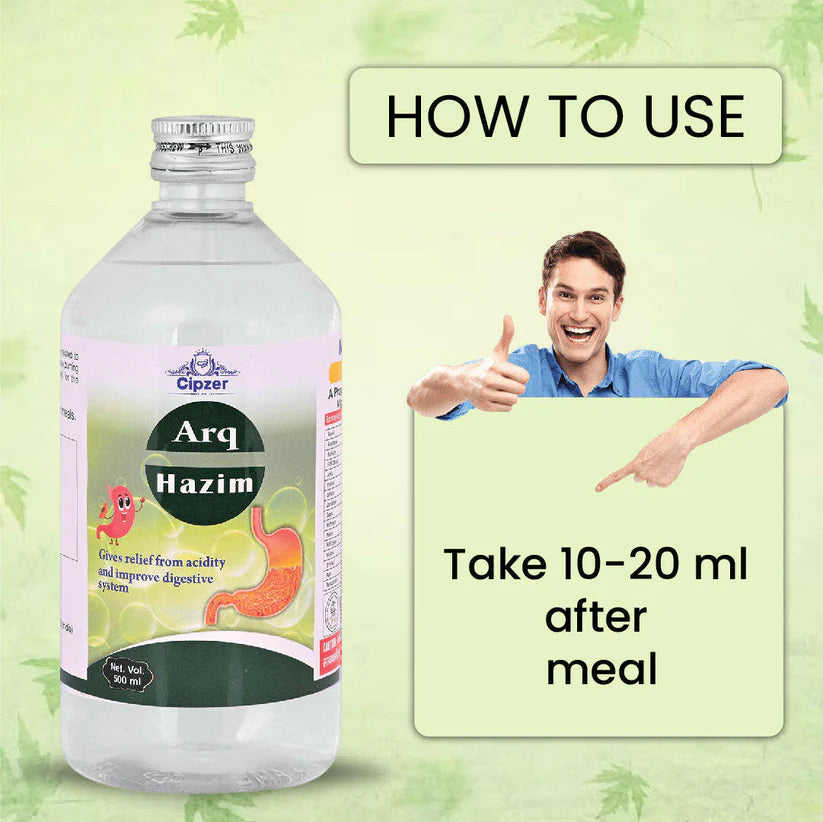 Cipzer Arq Hazim is an ayurvedic medicine that aids in supporting digestive health-related concerns such as hyperacidity, flatulence and heartburn. It helps relieve flatulence and constipation. It helps manage vomiting and burning sensation