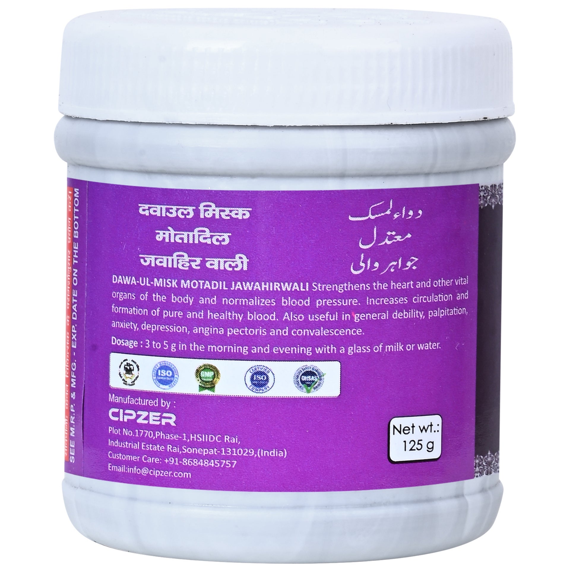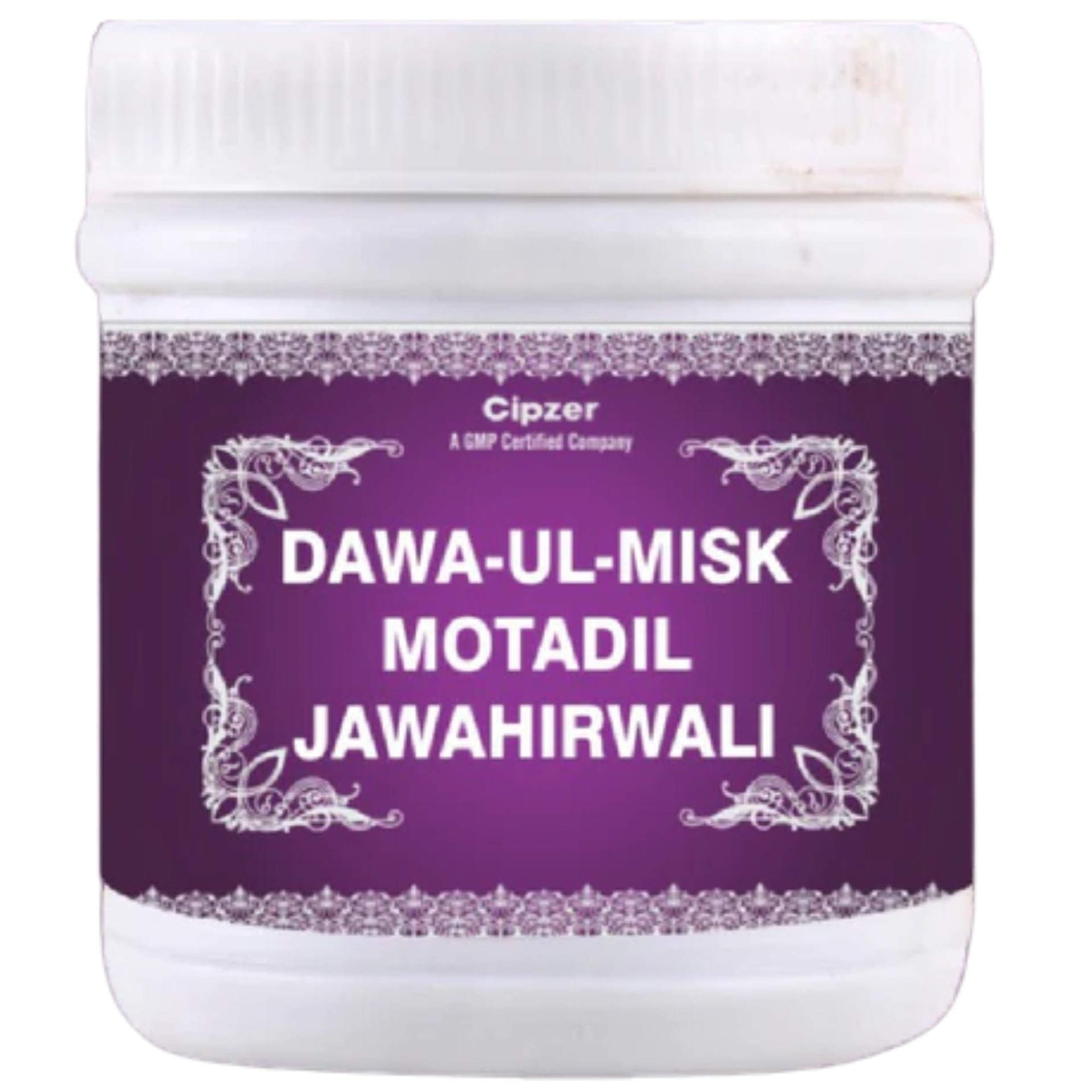 Cipzer Dawa ul Misk Motadil Jawahar Wali 60 gm is a premium Unani formulation crafted with the richness of natural herbs, minerals, and precious ingredients such as Jawahar (jewel essence) that are traditionally known to provide strength to the heart, brain, and nerves. This classical remedy is regarded as one of the most effective cardio-tonics in Unani medicine, designed to support cardiovascular health, boost energy, and improve general vitality. The formulation works by enhancing cardiac function, improving blood circulation, and toning the nervous system. It strengthens the heart muscles, reduces palpitation, and helps in relieving fatigue caused by physical or mental exertion. Its adaptogenic and rejuvenating effects make it highly beneficial for individuals suffering from weakness, stress, or loss of stamina. Dawa ul Misk Motadil Jawahar Wali also helps improve memory, concentration, and alertness by nourishing the brain and nervous system. It balances the body’s energy levels, making it suitable for people recovering from long-term illness or those who need additional stamina for daily activities. Unlike synthetic supplements, this formulation is entirely natural and carefully prepared under traditional Unani guidelines, ensuring purity, safety, and efficacy. It is a multi-benefit tonic that not only supports the heart but also promotes holistic well-being by restoring energy, boosting immunity, and maintaining a healthy balance of vital organs. Cipzer ensures authenticity and quality by formulating this product with great care, making it a trusted companion for heart health, nervous system support, and overall strength.