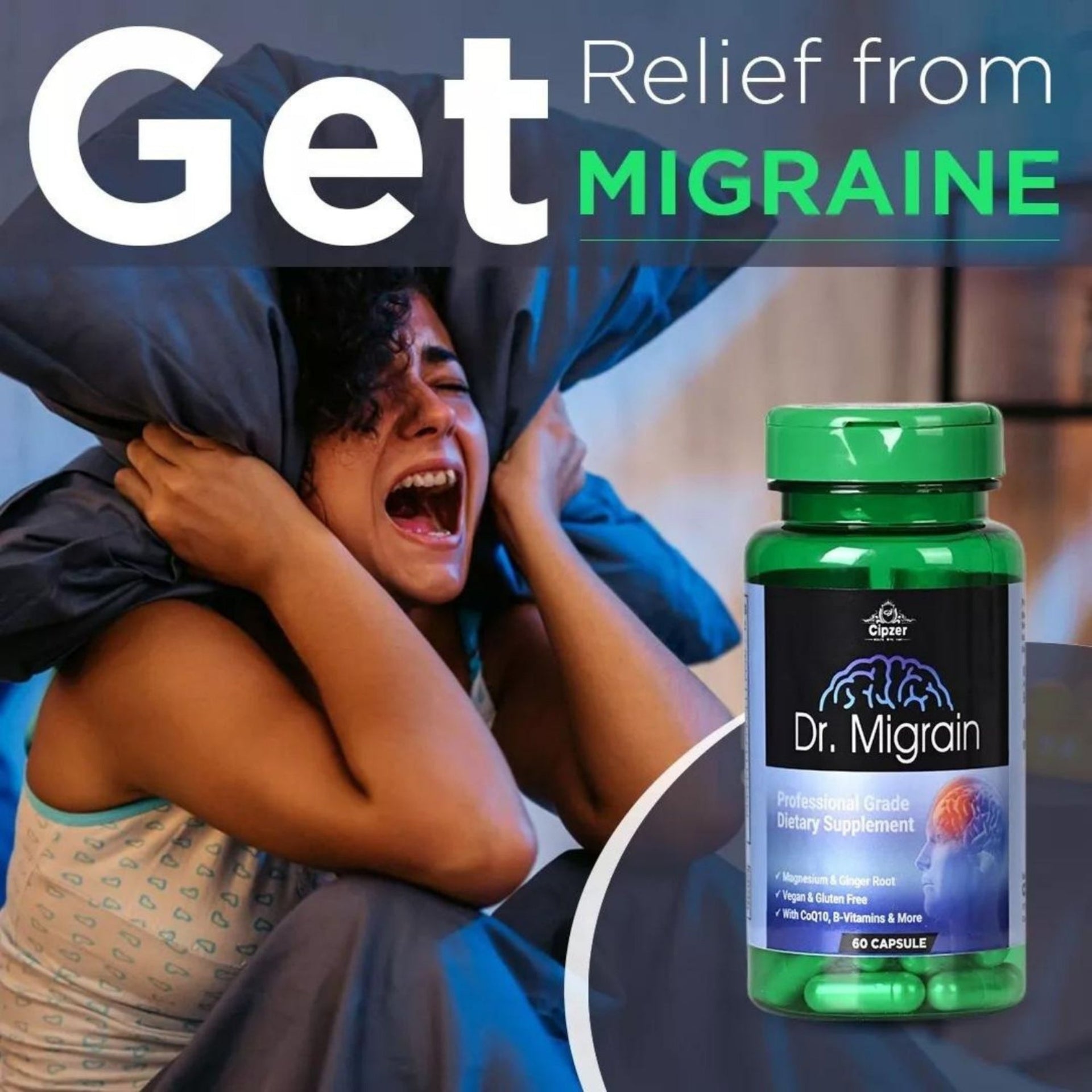 Cipzer Dr Migrain Capsule is a natural supplement that is designed to help alleviate migraine and severe headaches. It contains a blend of natural ingredients that have been traditionally used for their therapeutic benefits. The active ingredients in Dr Migrain 60 capsule help to relax the blood vessels in the brain, improve blood circulation, and promote relaxation, which can help to reduce the frequency and intensity of migraines and headaches. This natural supplement has a calming effect on the nervous system, which can help to reduce stress and anxiety. It is safe to use and does not have any known side effects.