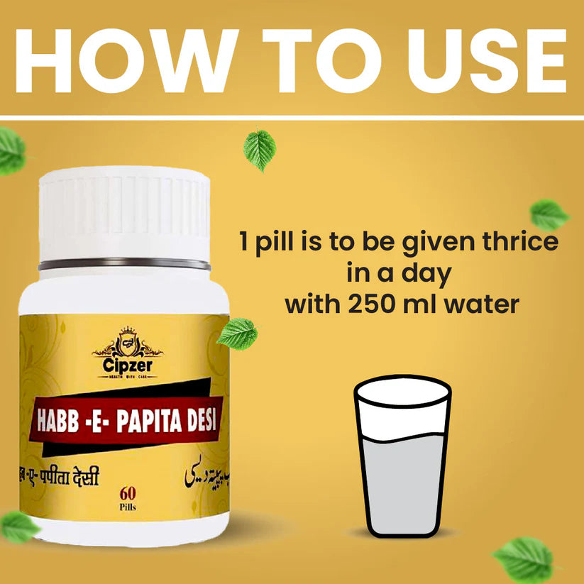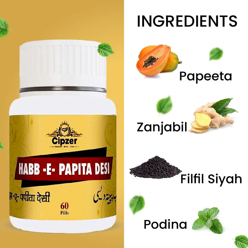 Cipzer Habb-E-Papita Desi Pill is an unani medicine containing papita, zanjabeel, filfil siyah, namak siyah and naushadar. It is indicated in digestive weakness, indigestion, excessive bloating and constipation.
