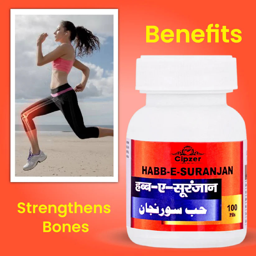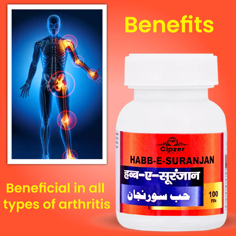 Cipzer Habb-E-Suranjan Pill is an unani medicine that helps manage rheumatoid arthritis, osteoarthritis and gout. It has analgesic and inflammatory action to help relieve joint pain