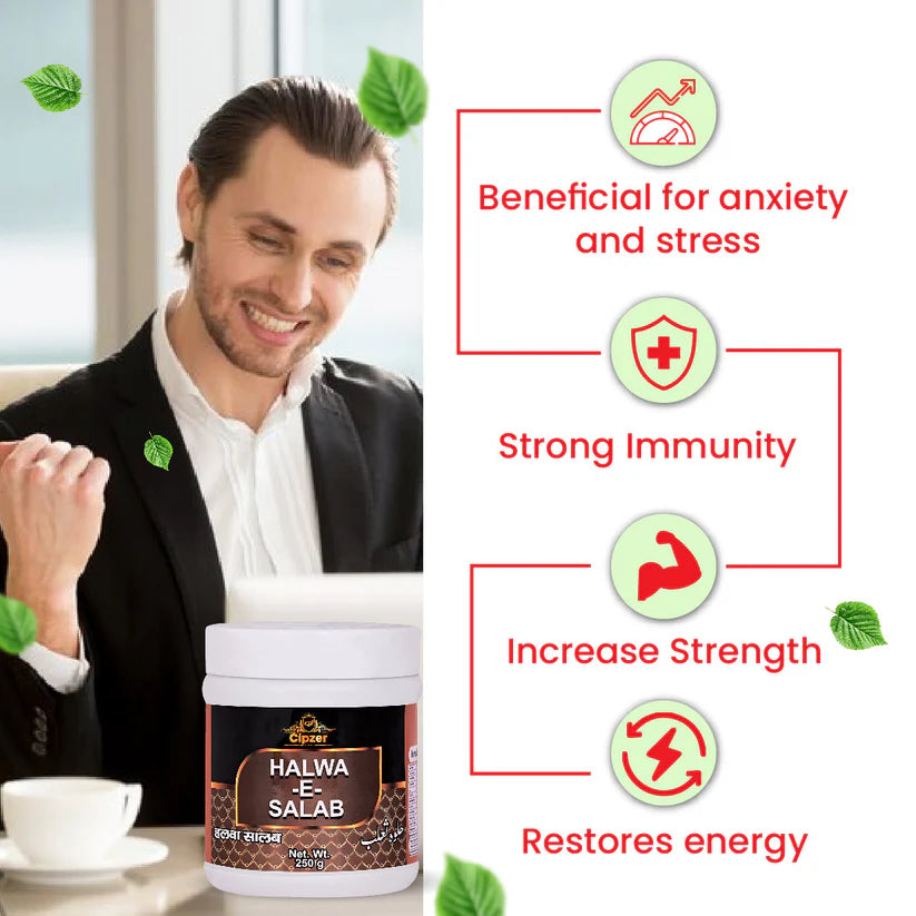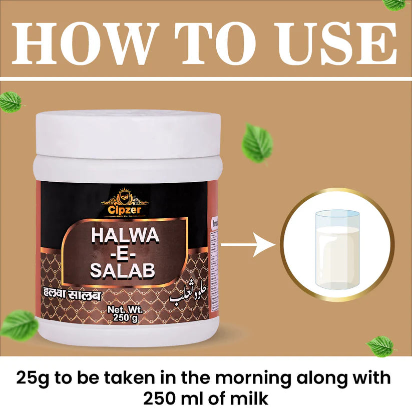 Cipzer Halwa-E-Salab acts as an Aphrodisiac. It helps to increase semen formation, improves the body's general debility, and makes the system refresh. It may restore energy and improve men's vitality, physical strength and stamina.