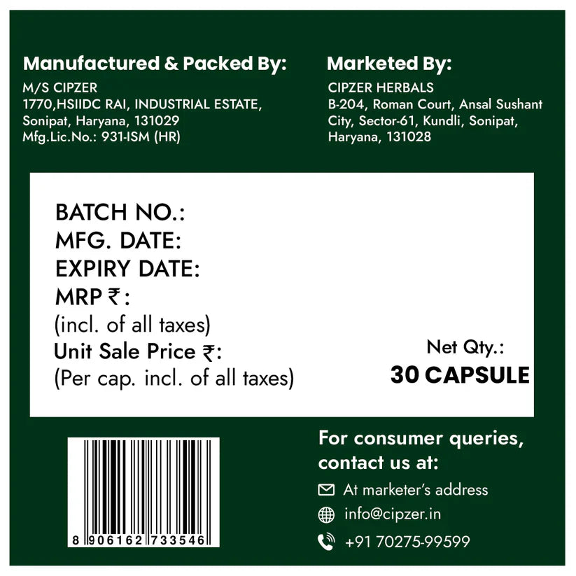 Additionally, Tagara helps relieve mild muscular tension and stress-related discomfort. Its calming properties relax the nervous system, reduce restlessness, and improve overall body-mind harmony. Cipzer Tagara 30 Capsules are ideal for adults experiencing fatigue, stress, or mental exhaustion, providing natural support for energy restoration and holistic well-being.