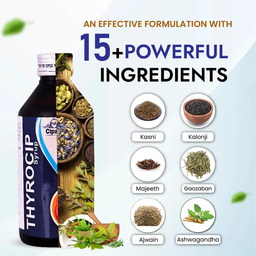 Cipzer Thyrocip Syrup is an Ayurvedic blend that aids with minor thyroid symptoms. It may help curtail excess weight gain. It may deal with hyperthyroidism and keeps your heart healthy.