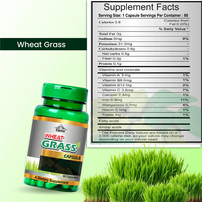Each capsule of Cipzer Wheatgrass is designed to support natural detoxification, improve digestion, strengthen immunity, and enhance energy levels. Wheatgrass is rich in chlorophyll, which works as a natural blood purifier and promotes healthy oxygen levels in the body. Its detoxifying effect helps eliminate harmful toxins, supports liver function, and improves skin glow from within.