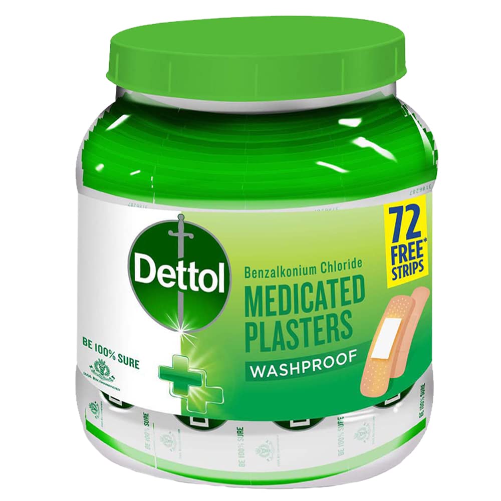 Dettol Medicated Plaster Washproof gives antiseptic protection to cuts and wounds. Its medicated pad does not stick to the wound and gives antiseptic protection through its benzalkonium chloride solution. It has a unique long-lasting adhesive that does not peel off in water and does not stain on removal. Dettol plaster jar contains 172 plasters for the entire family.