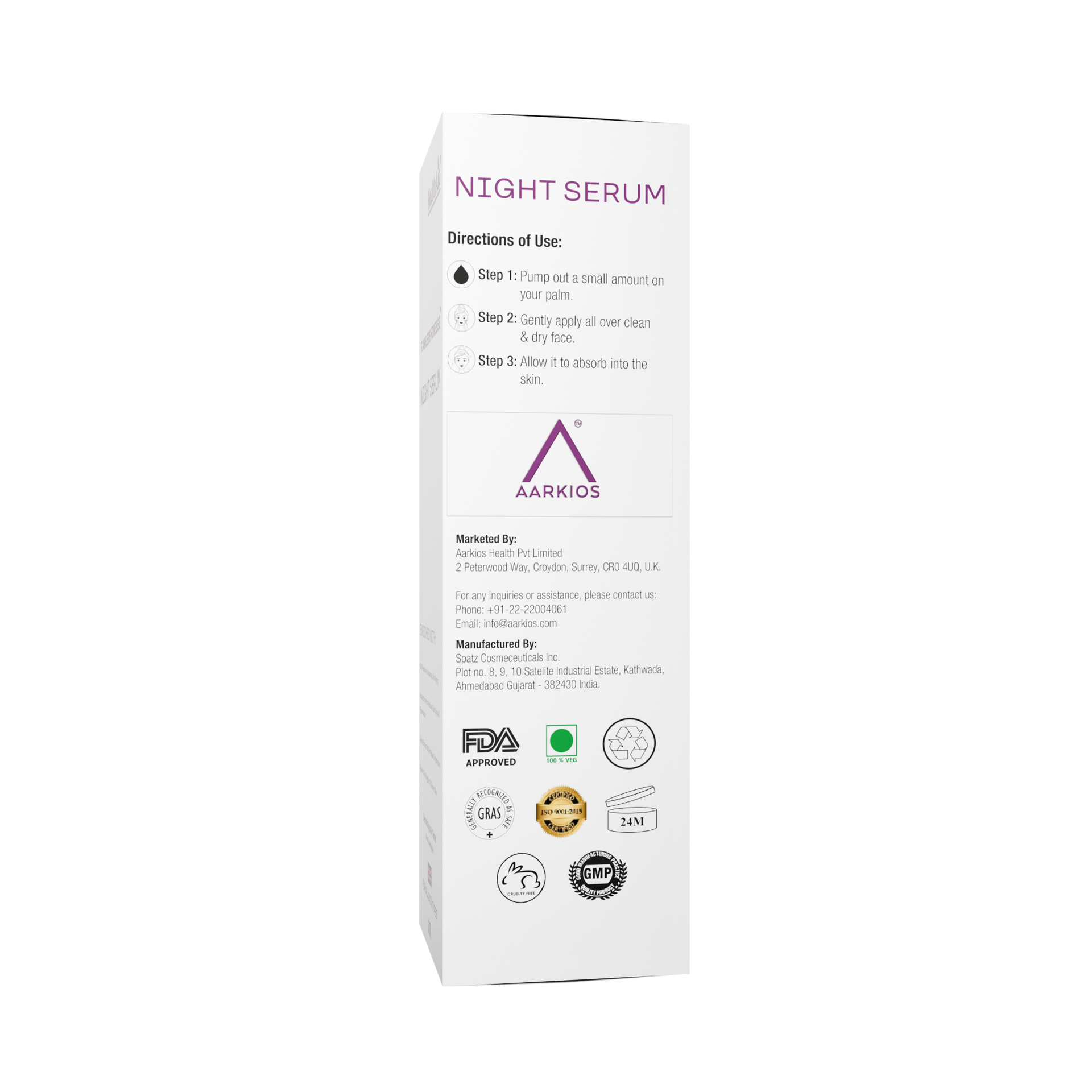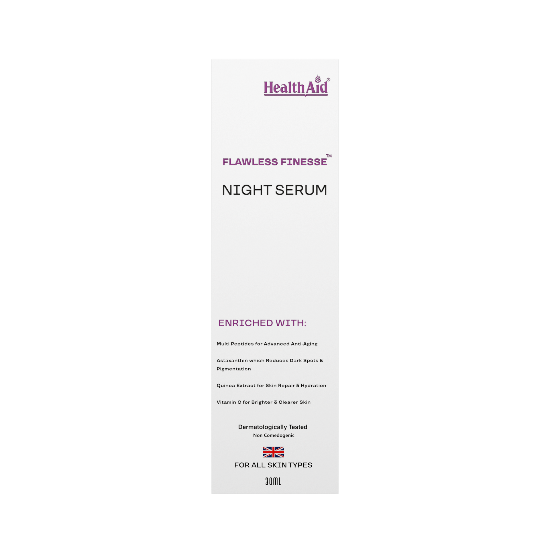 HealthAid Flawless Finesse Night Serum is a specially formulated night serum designed to help repair and rejuvenate your skin while you sleep. Enriched with powerful ingredients, it may help manage the appearance of dark spots, improve skin texture, and restore hydration. Ideal for all skin types, it can work overnight to help leave your skin visibly smoother, firmer, and more radiant by morning.