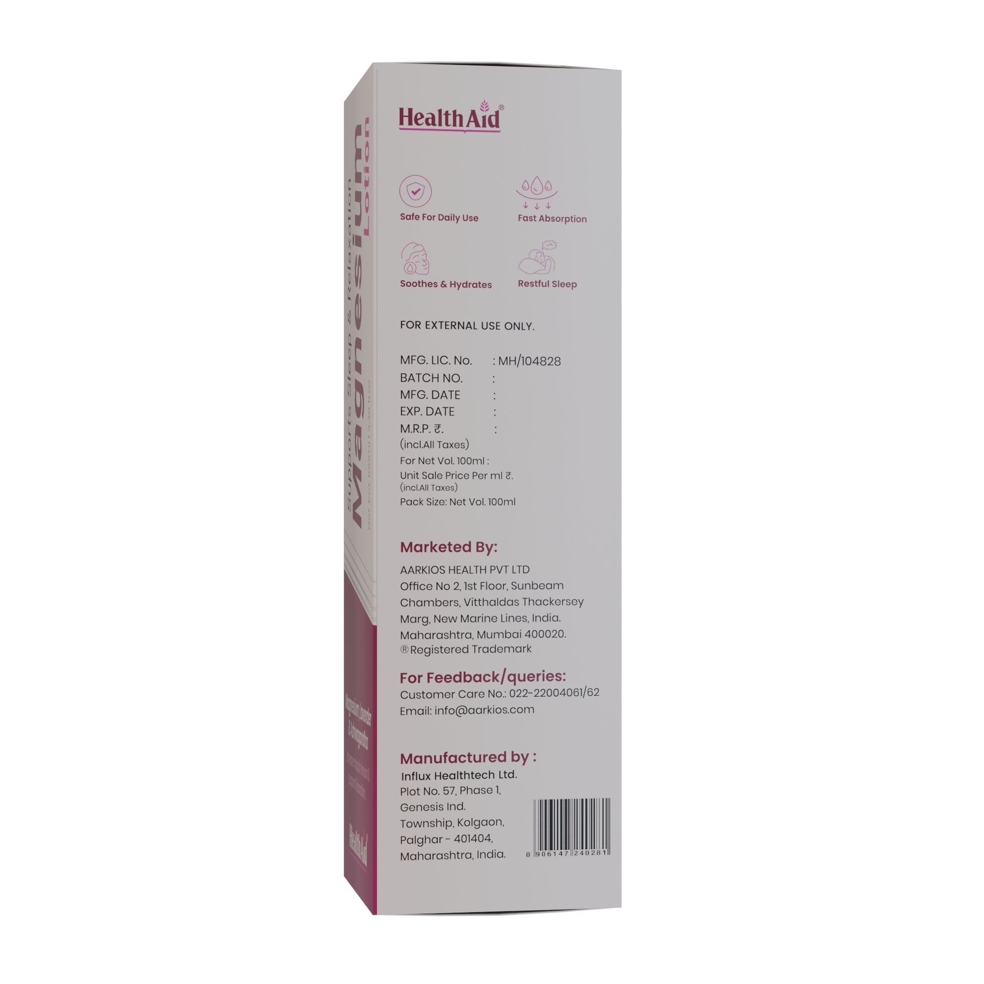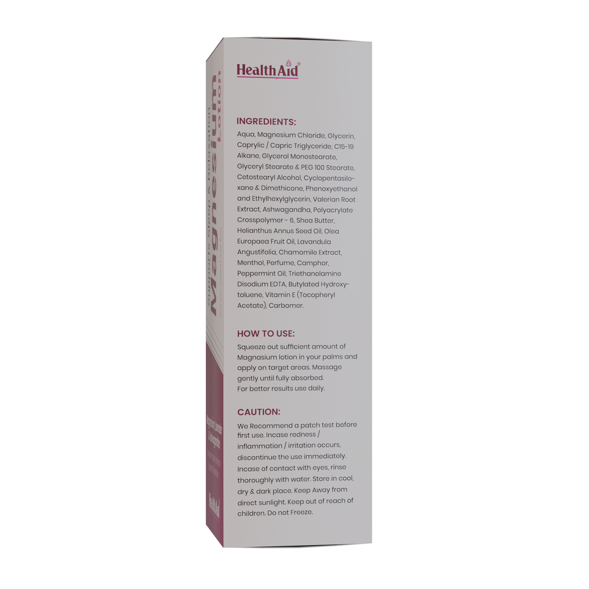 HealthAid Magnesium Sleep Body Lotion is a soothing and nourishing formula designed to support muscle comfort, ease muscle soreness and promote a deep, peaceful sleep. Infused with Magnesium Chloride, this lotion is specially formulated to replenish magnesium levels through the skin, helping to relax both body and mind. The powerful blend of Valerian Root, Ashwagandha, and essential oils like Lavender, Peppermint, and Chamomile creates a calming, stress-relieving experience, while Shea Butter and Vitamin E deeply moisturize and soften the skin. Perfect for anyone looking to promote relaxation, alleviate muscle tension, and maintain skin hydration, this gentle, non-greasy lotion is ideal for daily use, helping you feel rejuvenated and restored