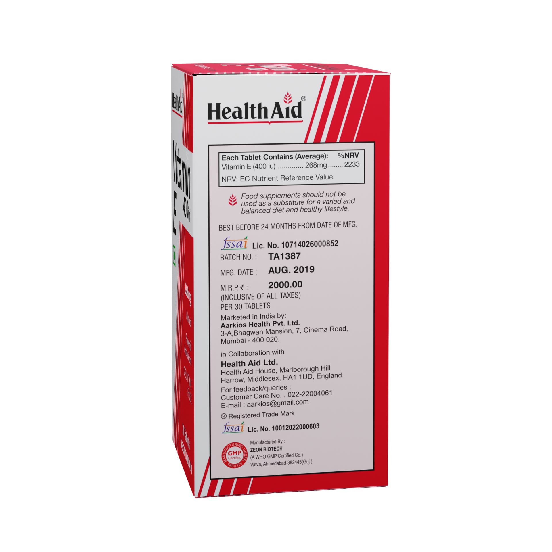 Healthaid Vitamin E 400IU Tablet contains Vitamin E, which functions as a natural, powerful antioxidant, helping to combat free radical damage to the body. It is also used to support vital nutrients such as Vitamin A and unsaturated fatty acids from oxidative damage. Oxidation of cells is a process connected to cellular ageing, which can bring harm to the body. Vitamin E may help to maintain a healthy heart, support red blood cells, and nourish the skin. These Vitamin E capsules are suitable for vegetarians and are gelatine-free.