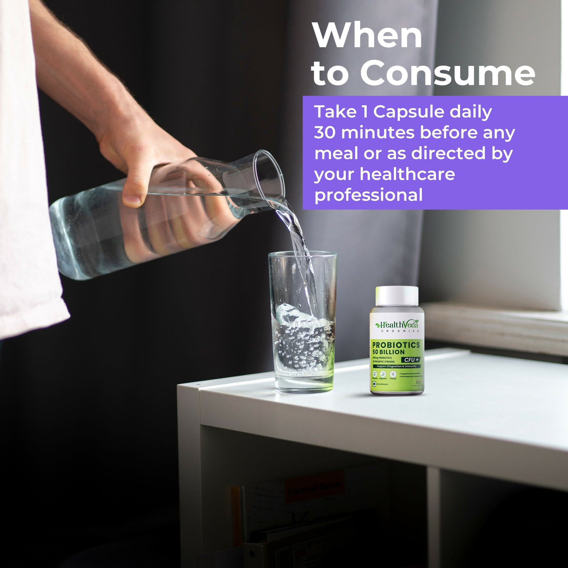 HealthVeda Probiotics 50 Billion Capsule Health veda organics probiotics capsules are a wholesome combination of natural ingredients that ensure the smooth functioning of your gut, maintain the integrity of the intestinal lining and boost immunity for overall well-being. 70% of your immunity lies in your gut. These probiotics supplement for the gut gives daily supplementation with a high dose of good bacteria which acts as immunity boosters. These supplements promote stronger immunity, discourages harmful bacteria, regulate cholesterol levels, and manages blood pressure. Together, it ensures a healthy gut that enhances overall performance for better results. Health veda organics probiotics supplements enhance digestion efficiency. It keeps your gut health in place and you energized throughout the day. These supplements are safe and effective to use, pure, natural and health-friendly, vegan.